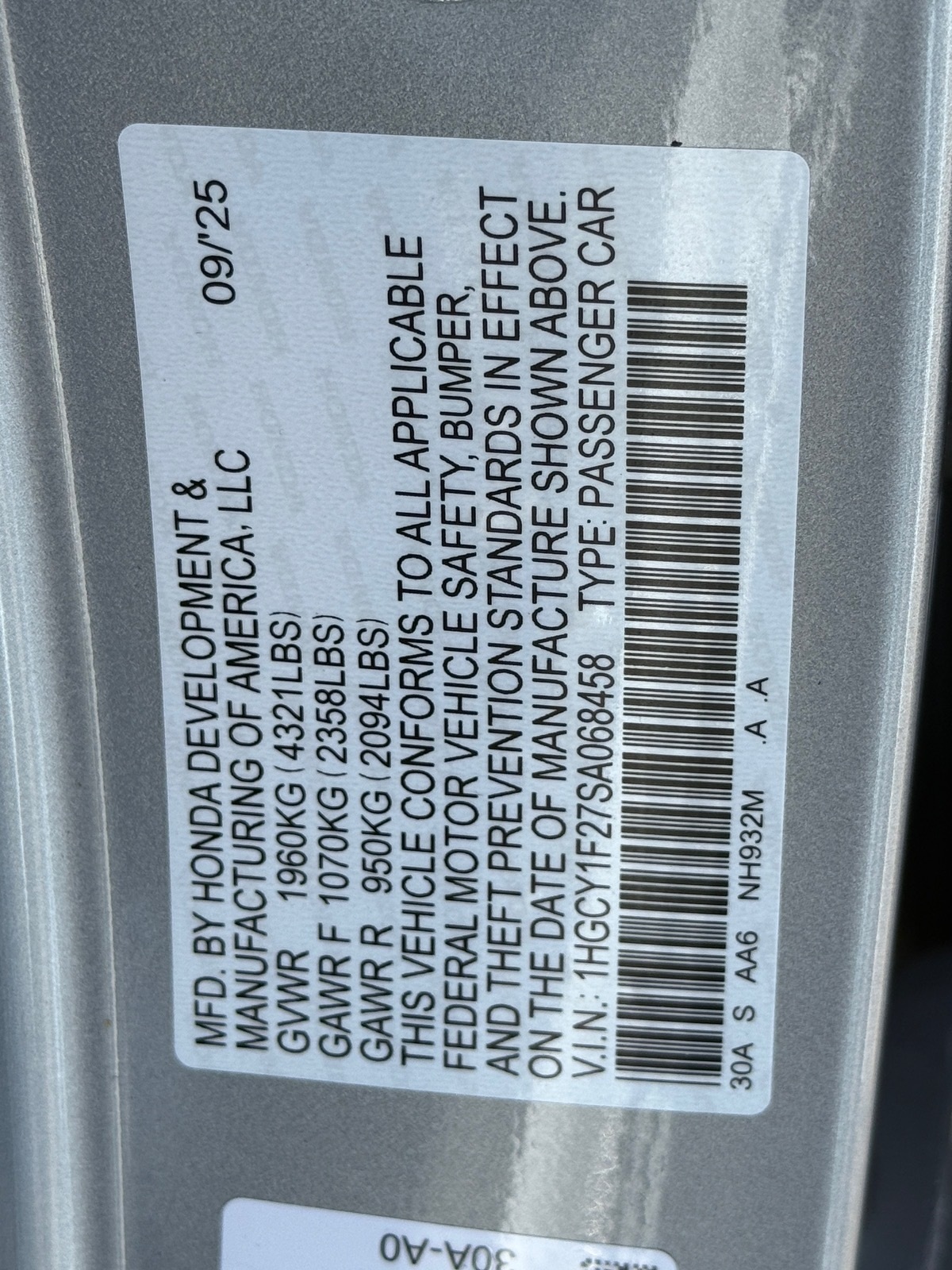 - VIN : 1HGCY1F27SA068458