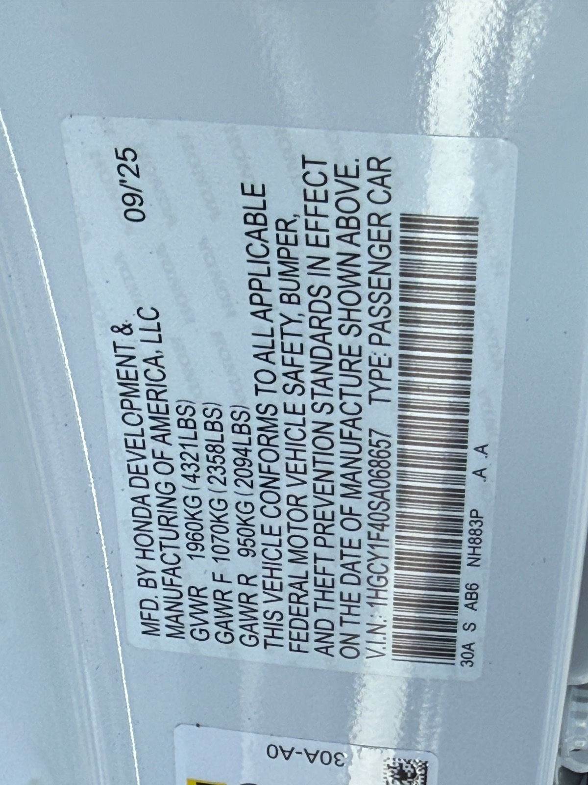 - VIN : 1HGCY1F40SA068657