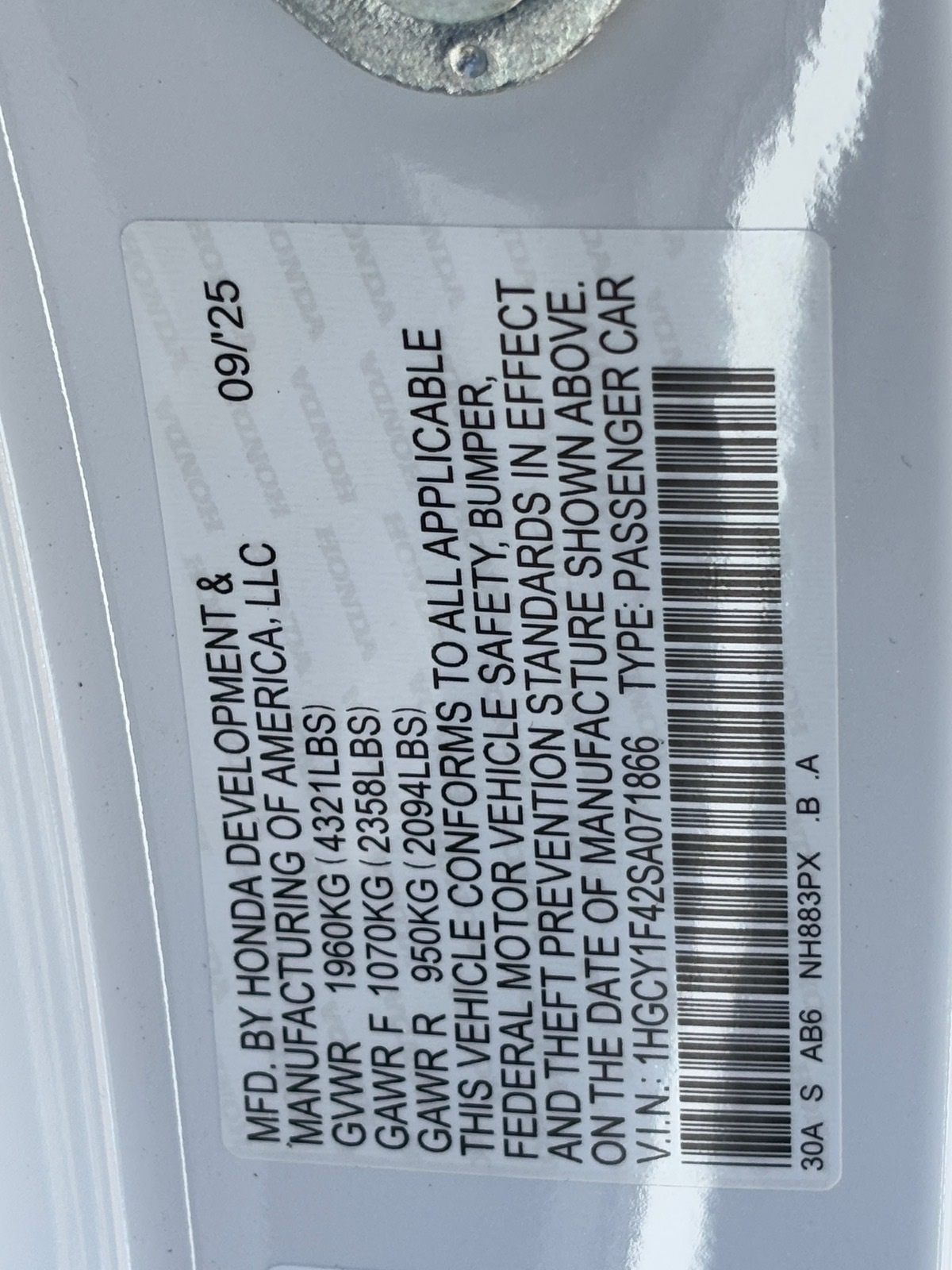 - VIN : 1HGCY1F42SA071866