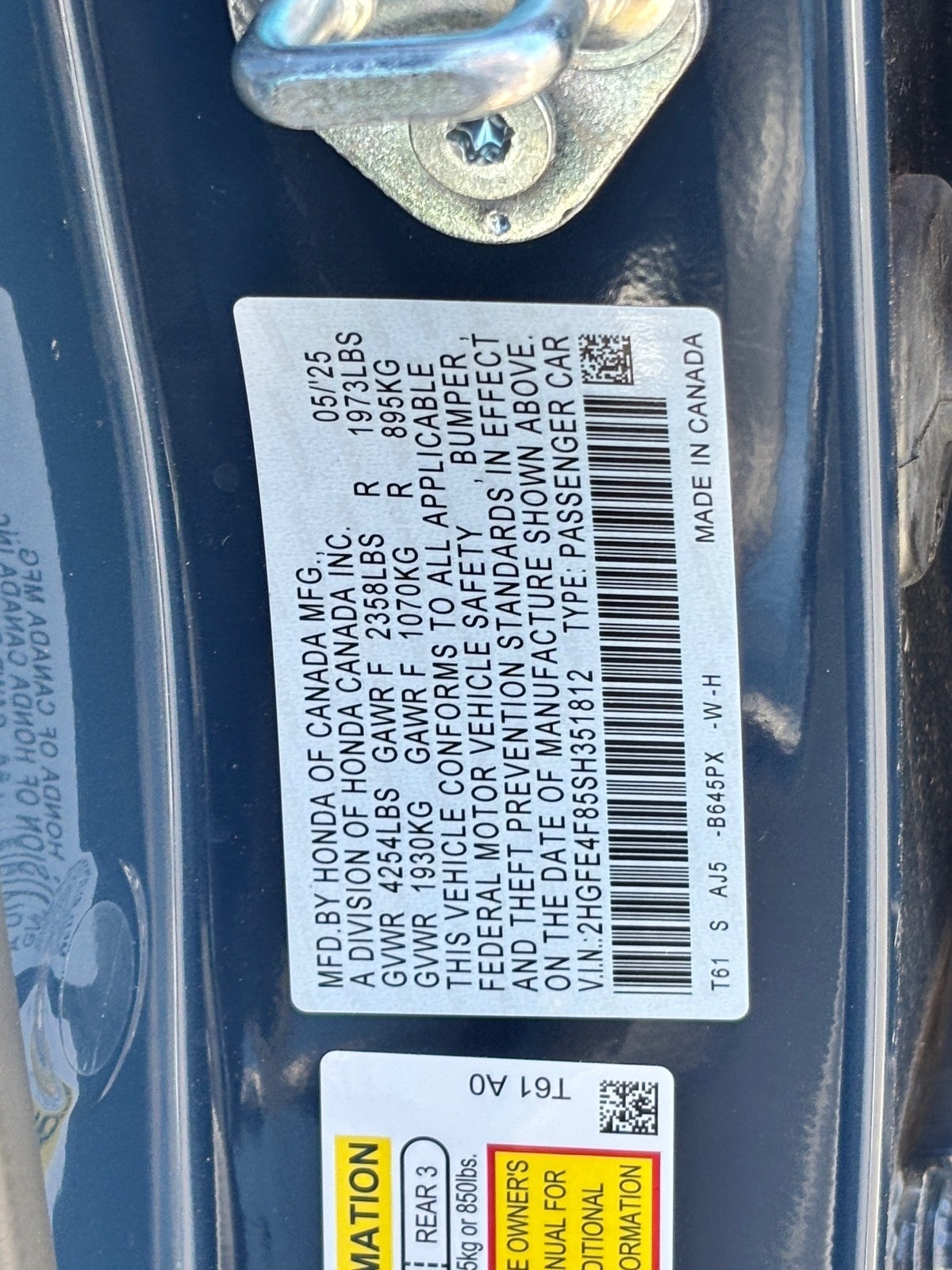 - VIN : 2HGFE4F85SH351812
