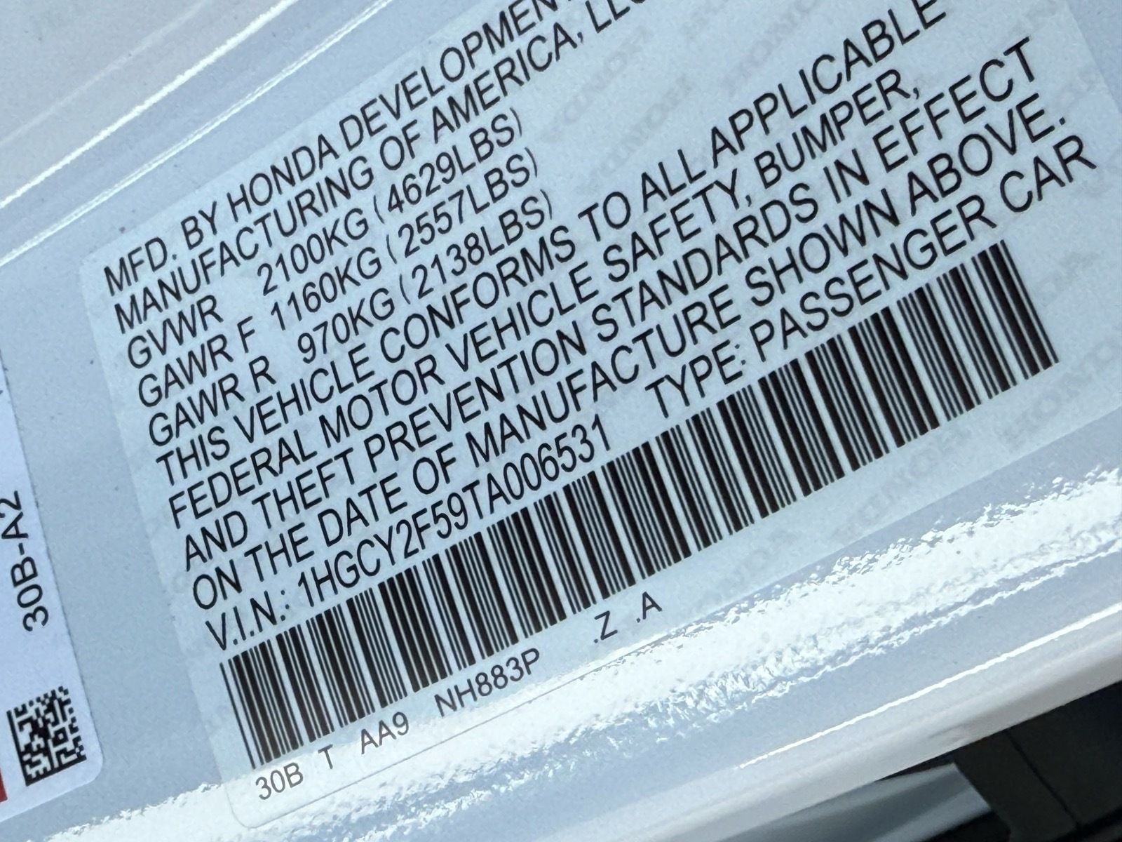 - VIN : 1HGCY2F59TA006531