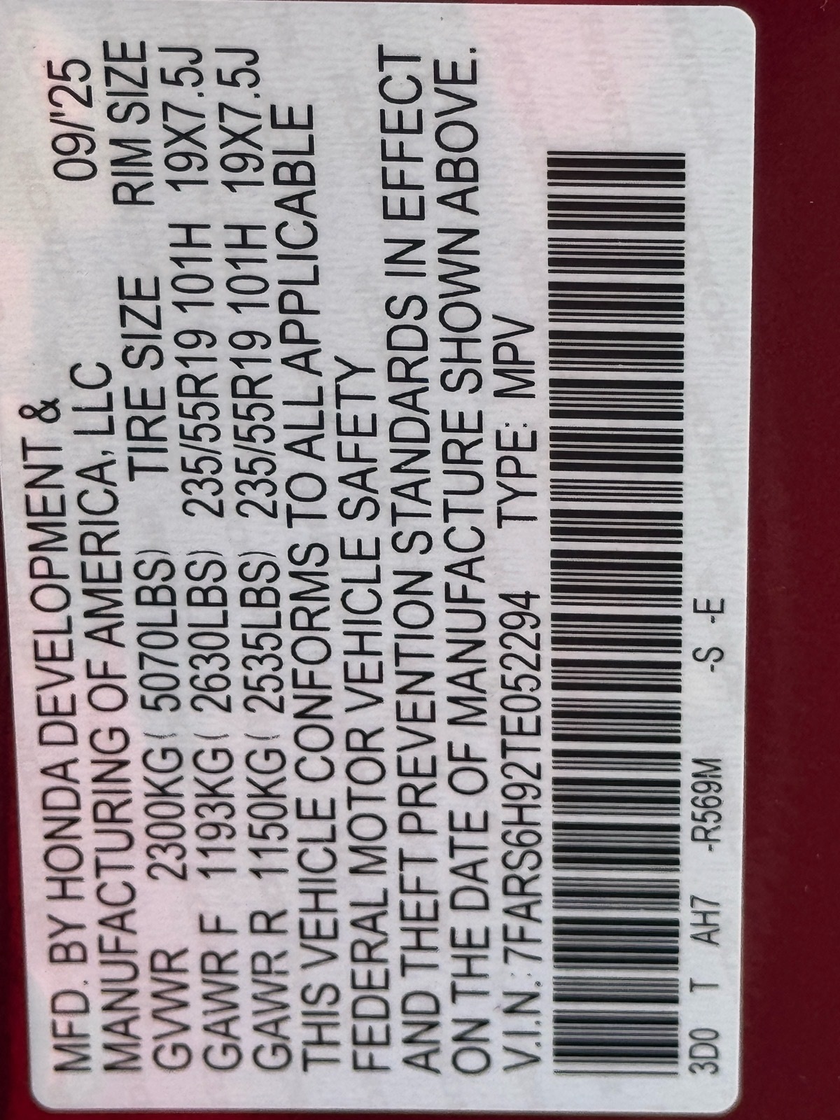 - VIN : 7FARS6H92TE052294