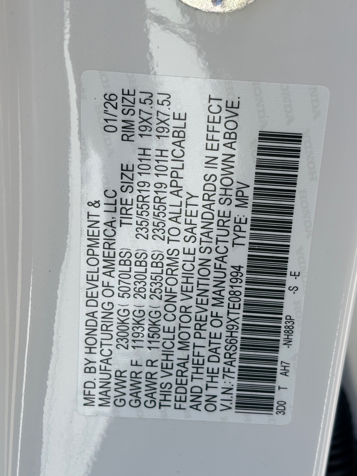 - VIN : 7FARS6H9XTE081994