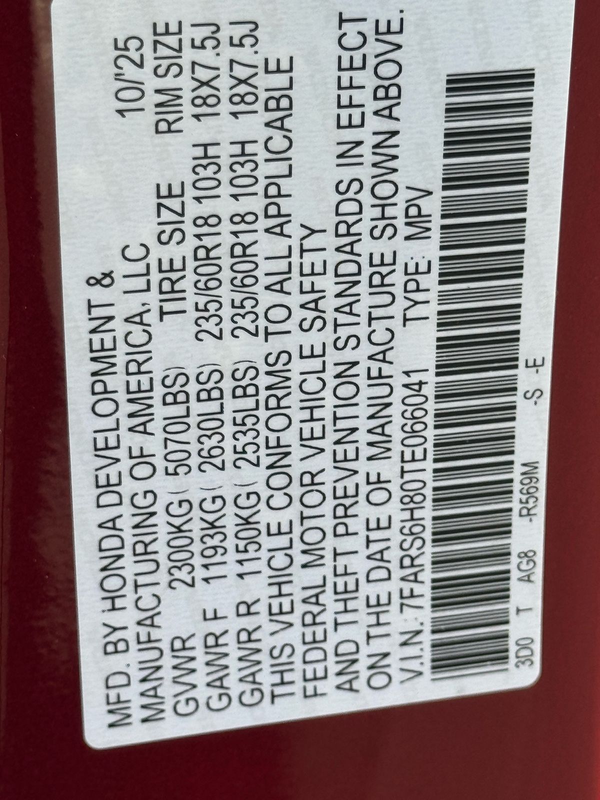 - VIN : 7FARS6H80TE066041