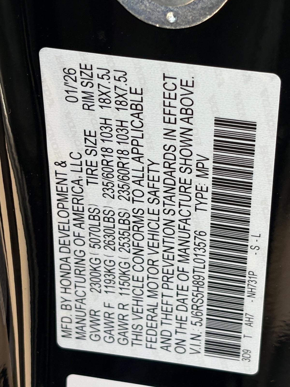 - VIN : 5J6RS5H89TL013576