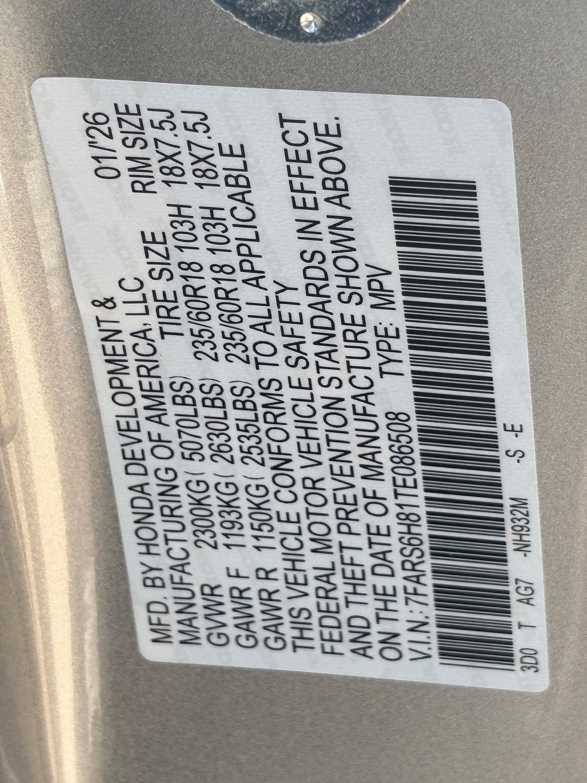 - VIN : 7FARS6H81TE086508