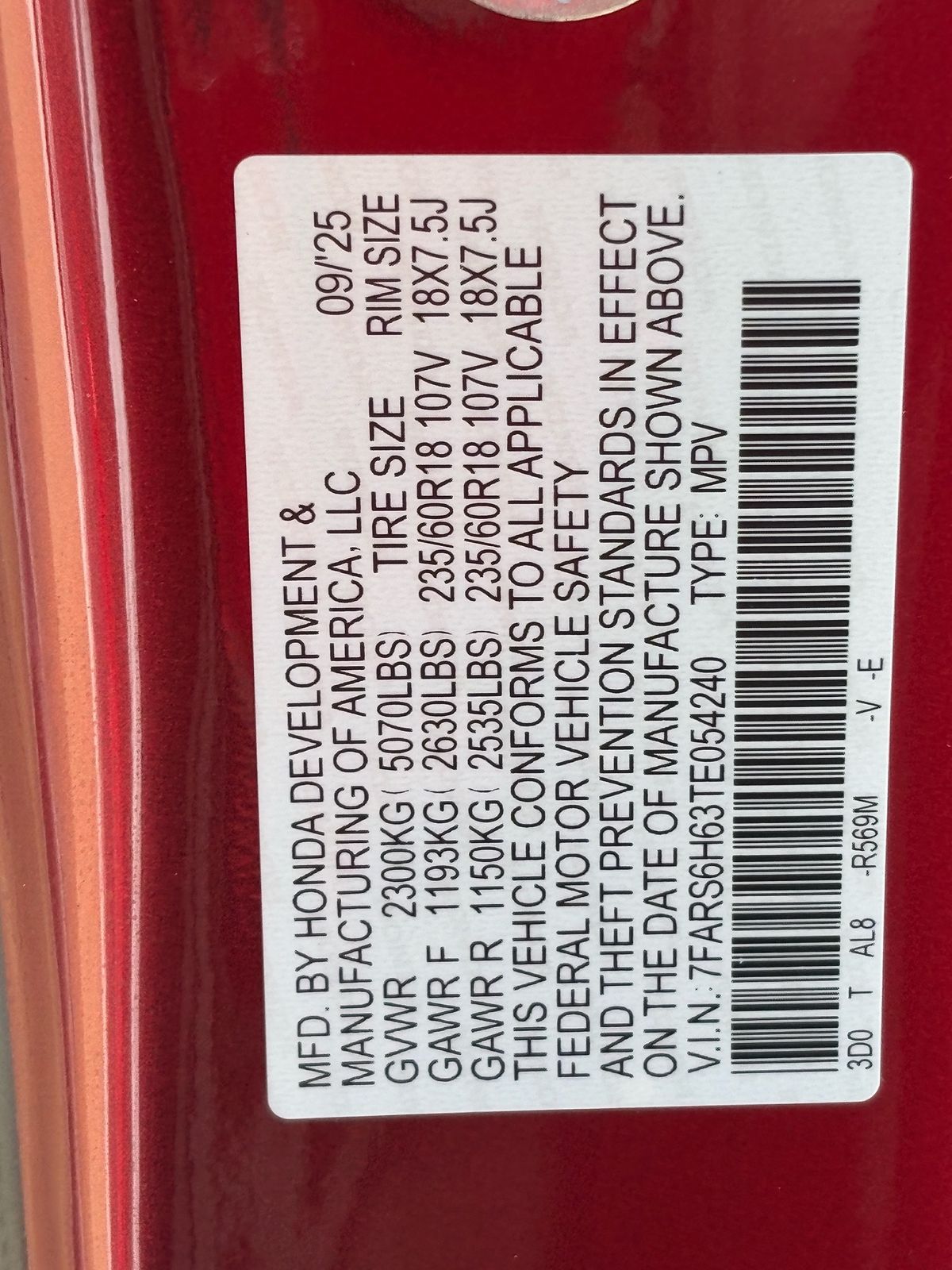- VIN : 7FARS6H63TE054240