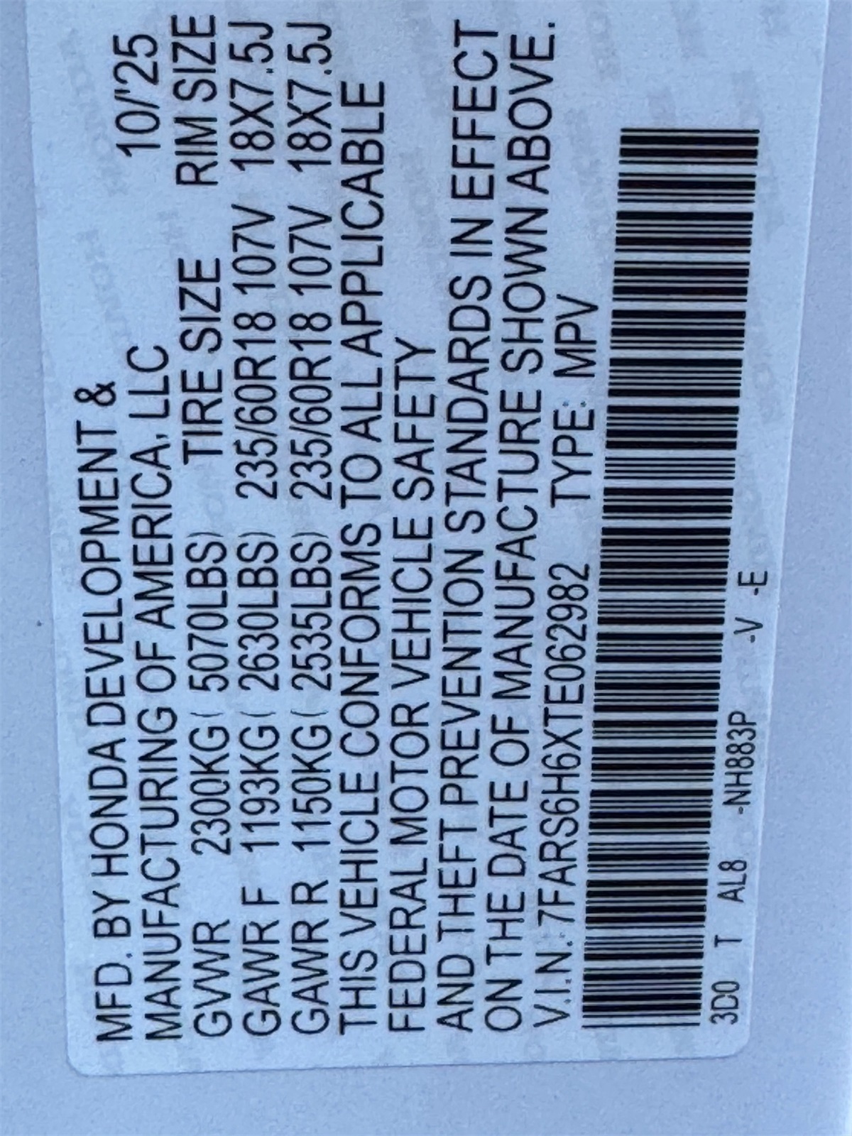 - VIN : 7FARS6H6XTE062982