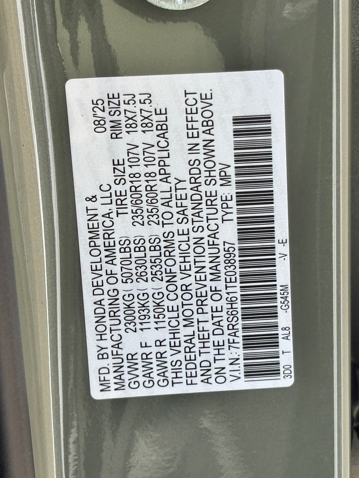 - VIN : 7FARS6H61TE038957