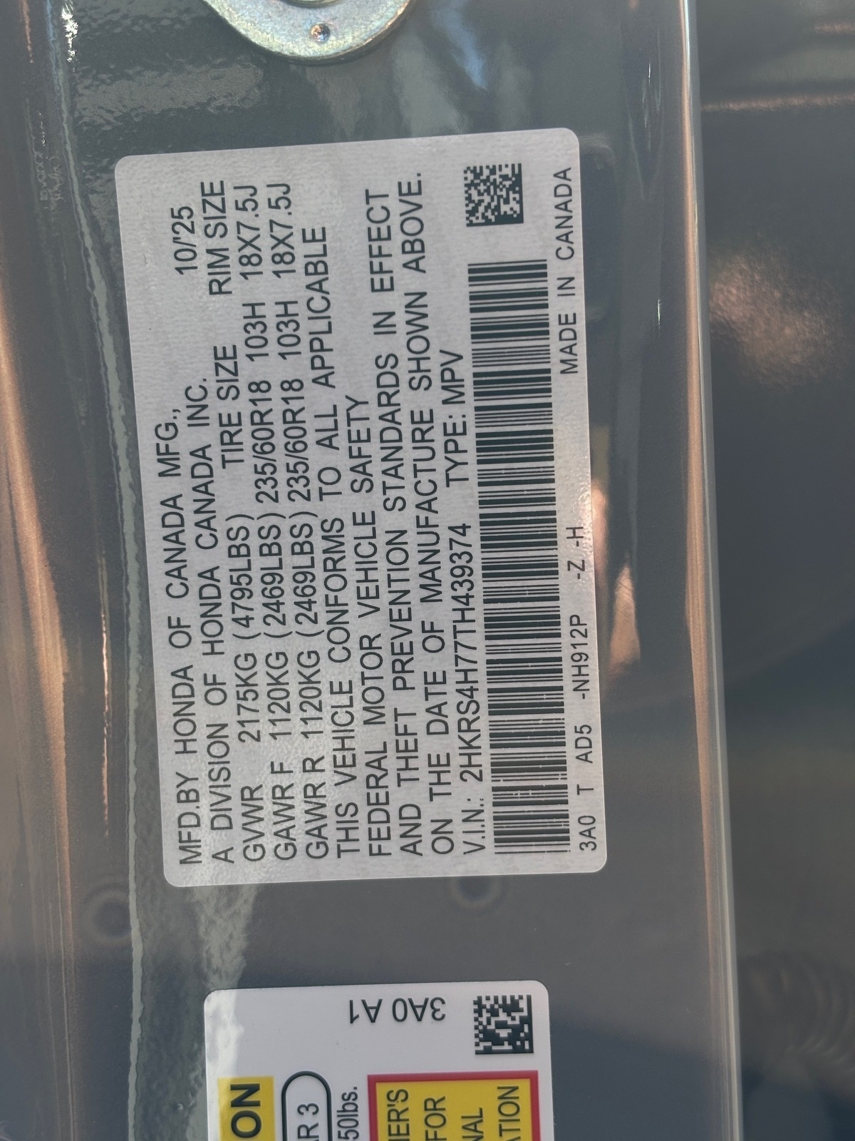 - VIN : 2HKRS4H77TH439374