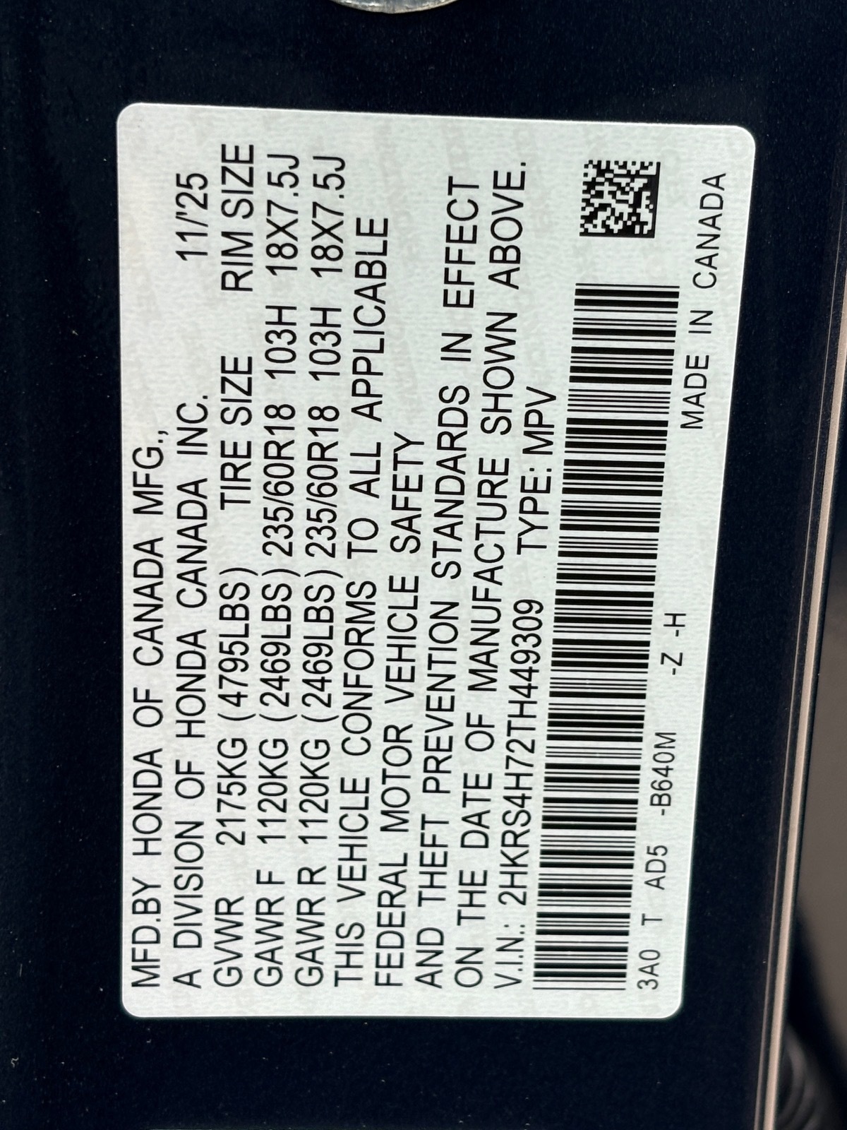 - VIN : 2HKRS4H72TH449309