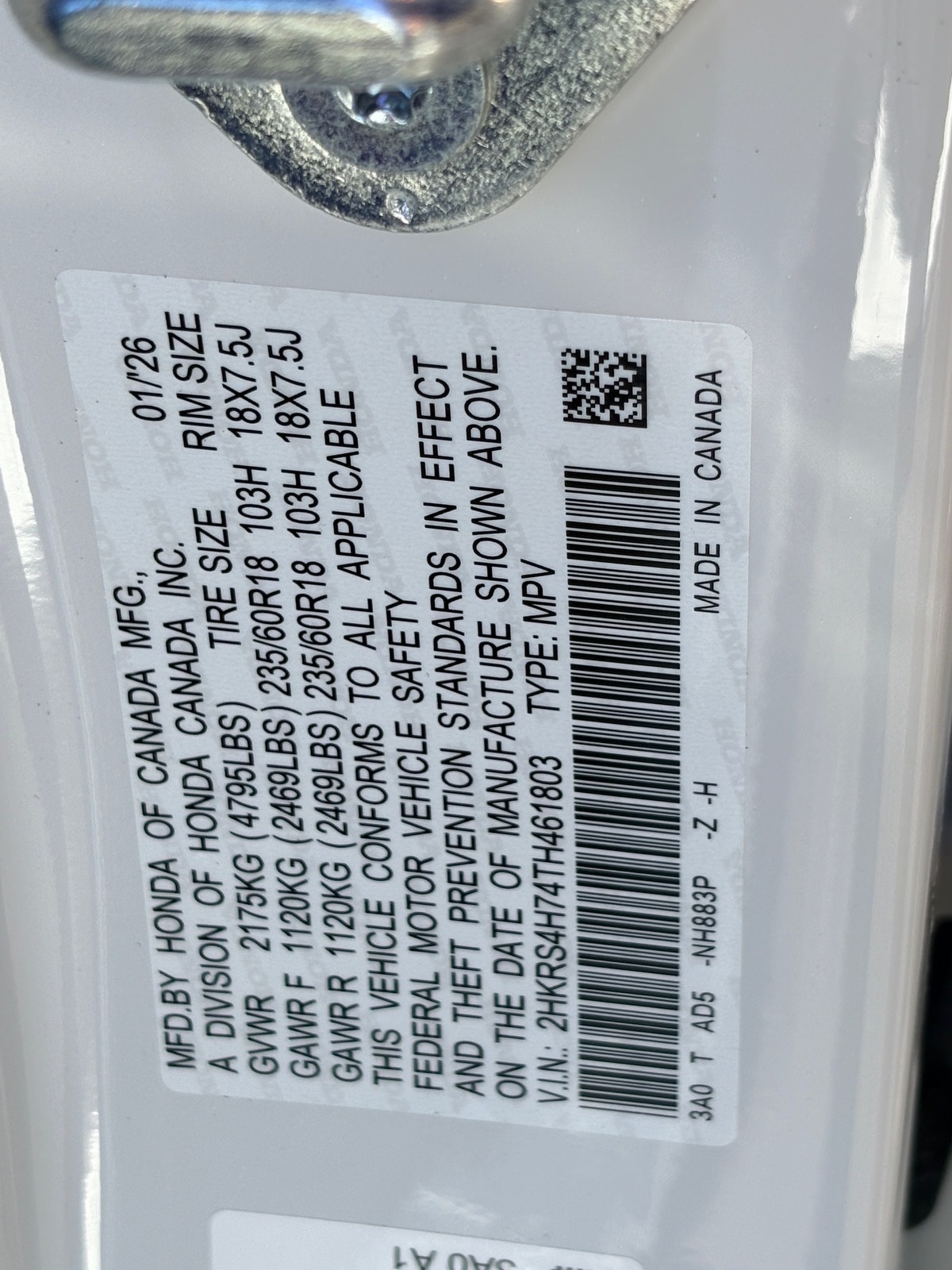 - VIN : 2HKRS4H74TH461803