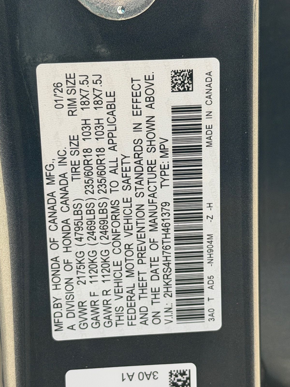 - VIN : 2HKRS4H76TH461379