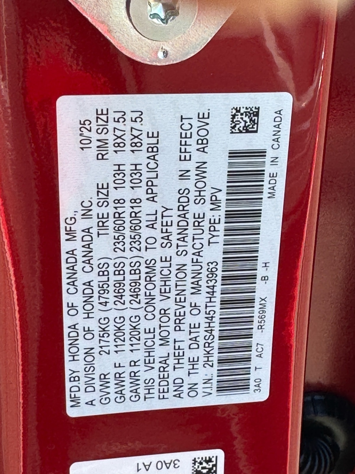 - VIN : 2HKRS4H45TH443963
