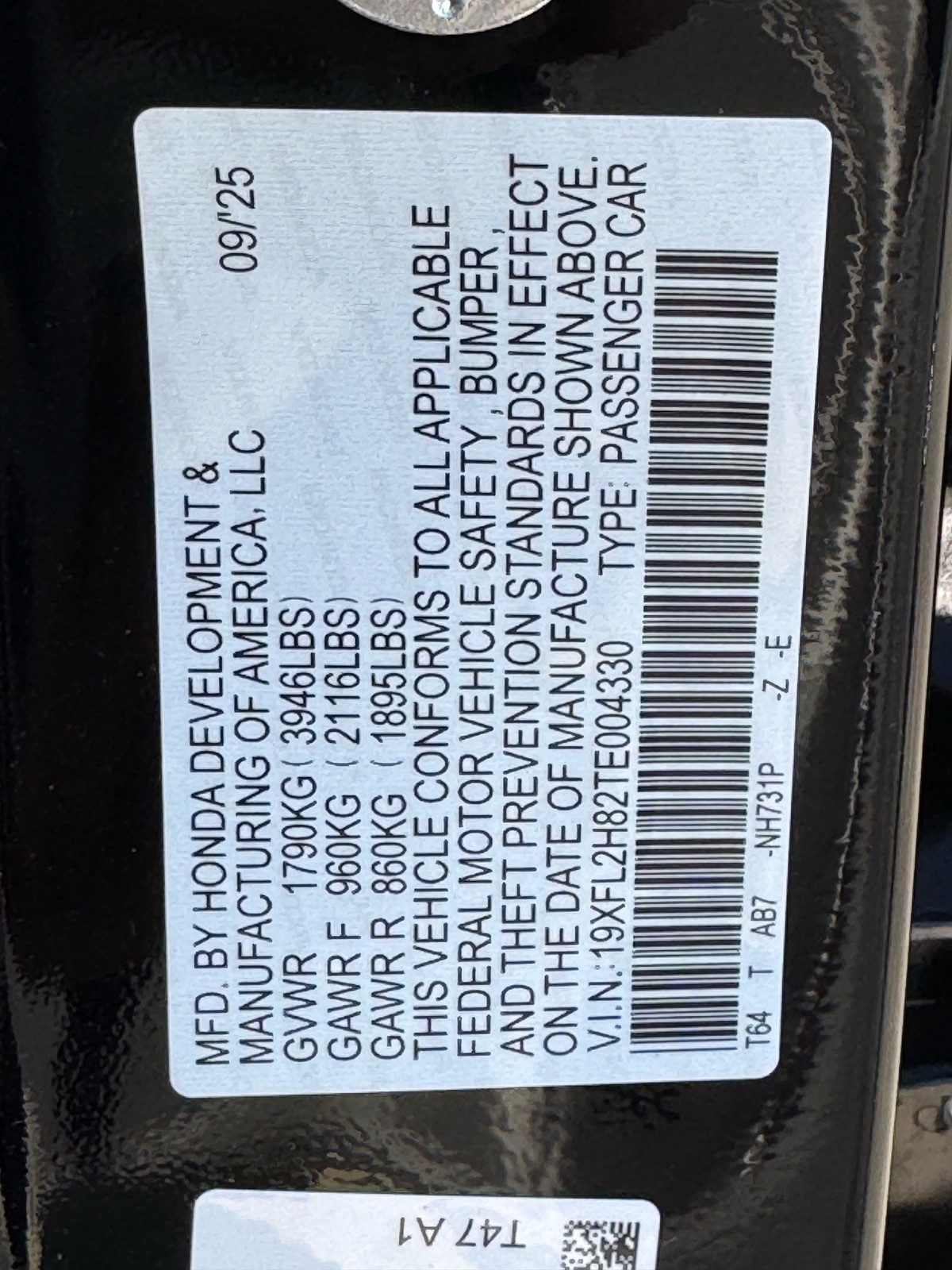 - VIN : 19XFL2H82TE004330