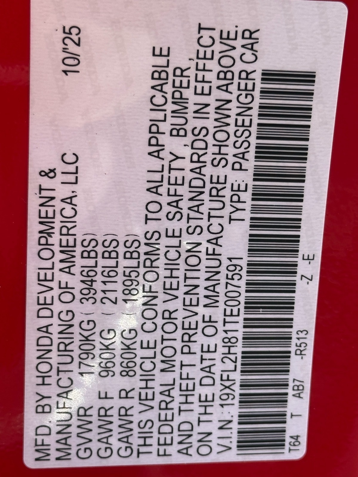 - VIN : 19XFL2H81TE007591