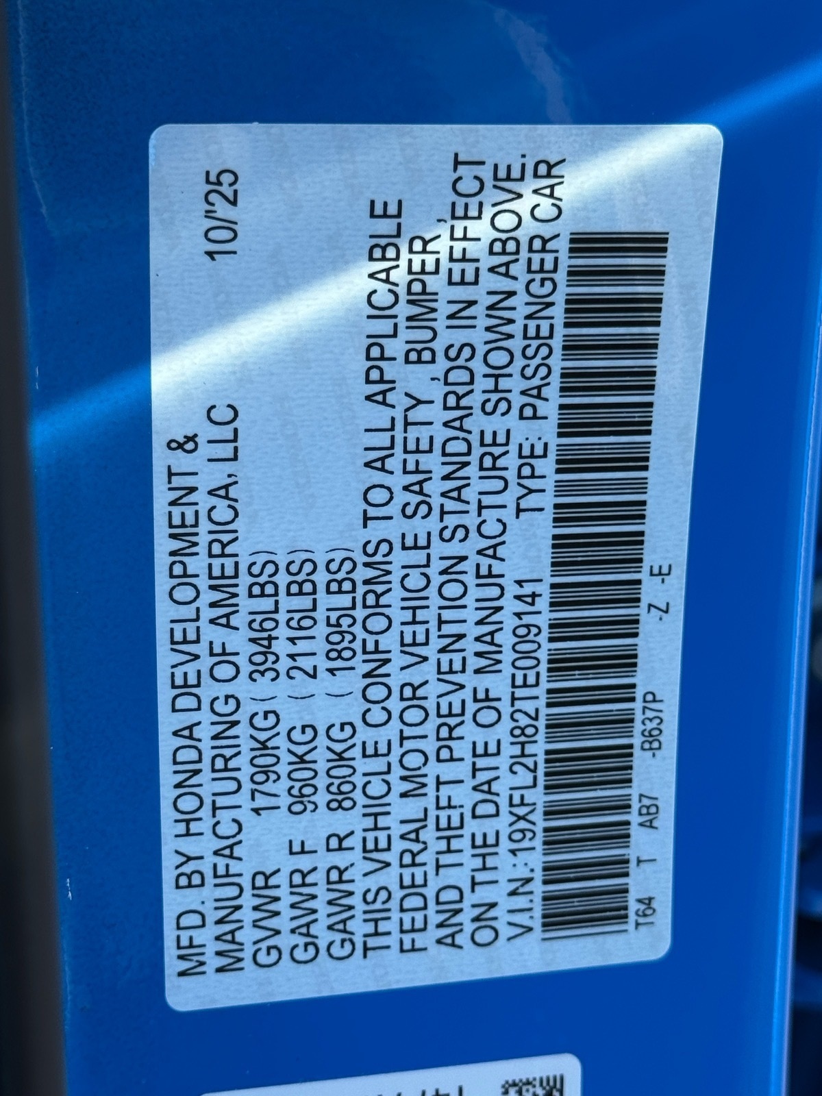 - VIN : 19XFL2H82TE009141