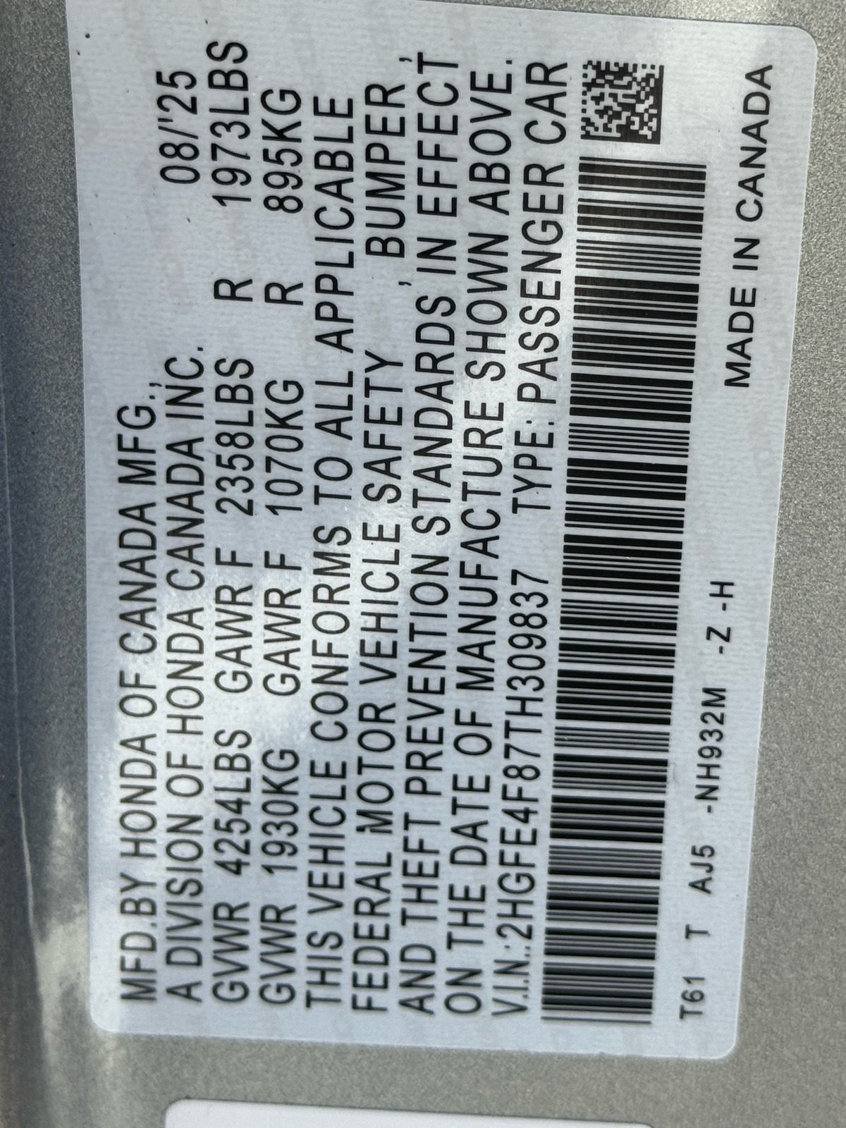 - VIN : 2HGFE4F87TH309837