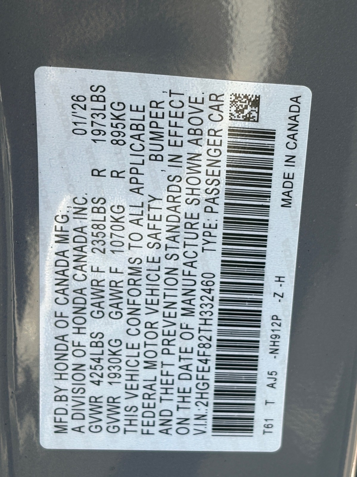 - VIN : 2HGFE4F82TH332460