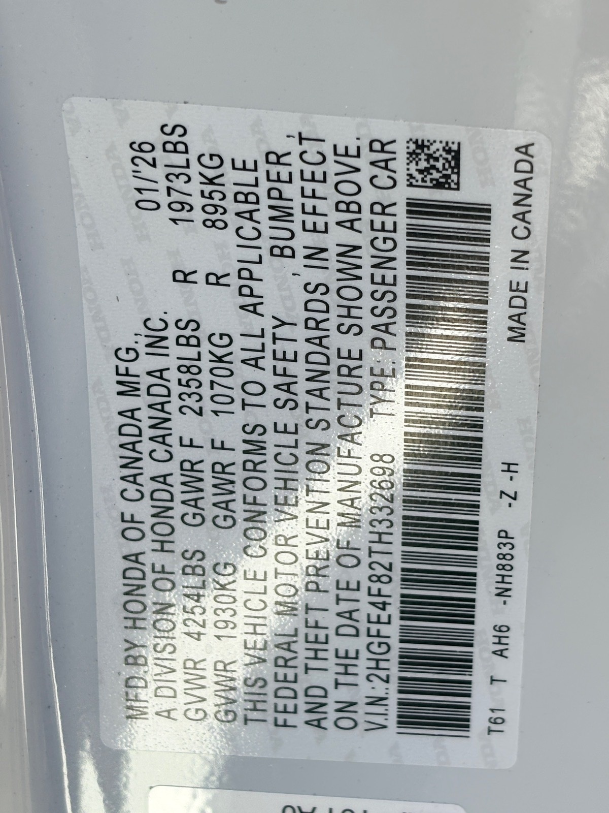 - VIN : 2HGFE4F82TH332698