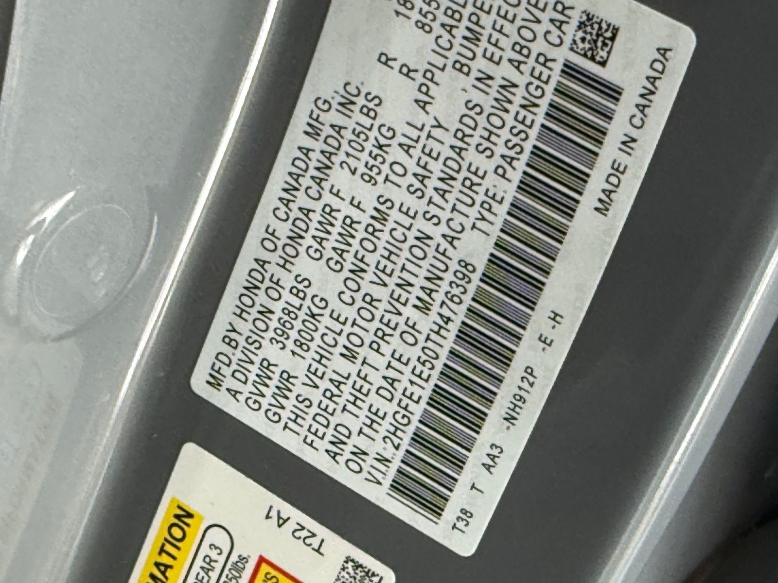 - VIN : 2HGFE1E50TH476398