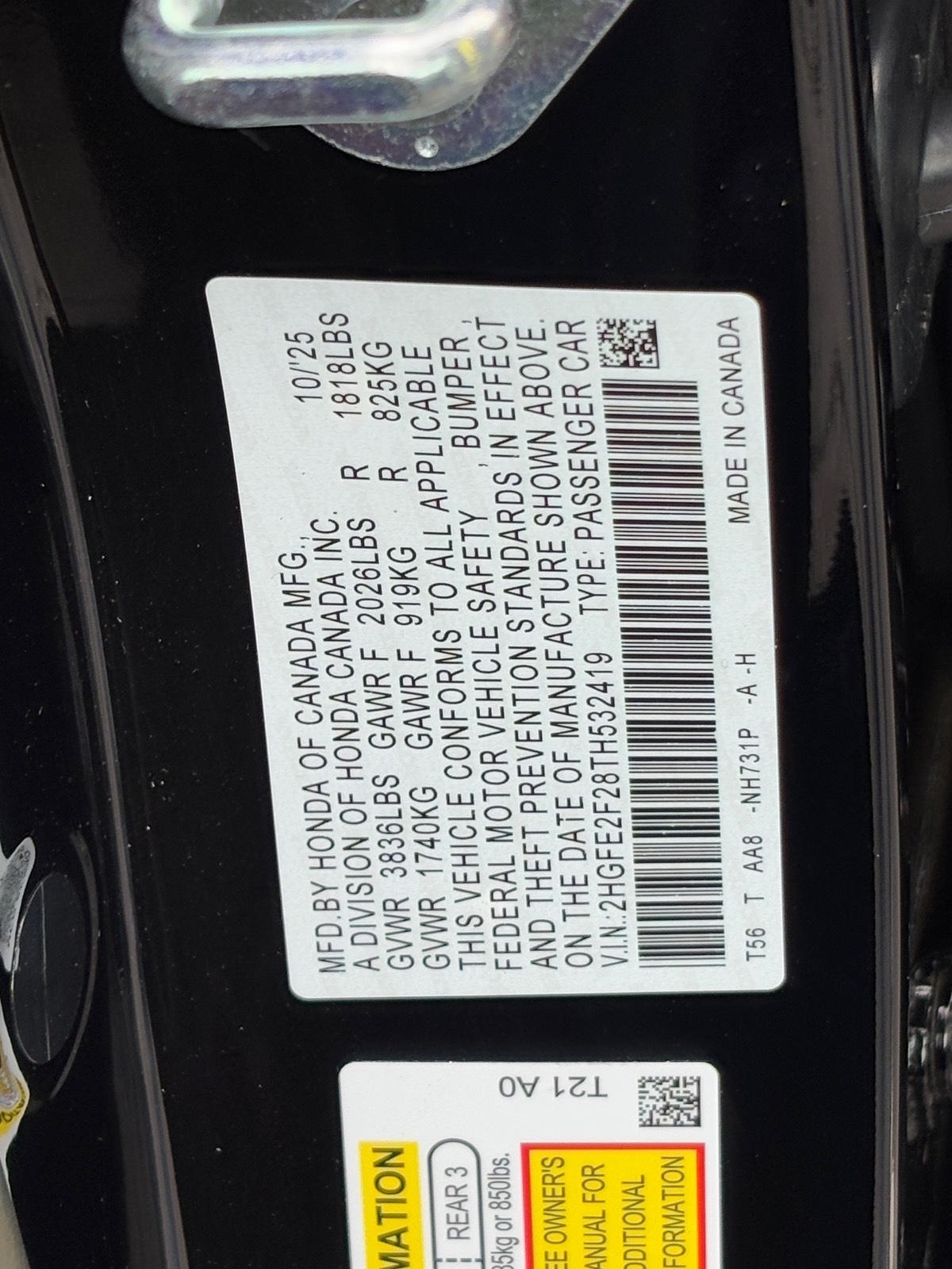 - VIN : 2HGFE2F28TH532419