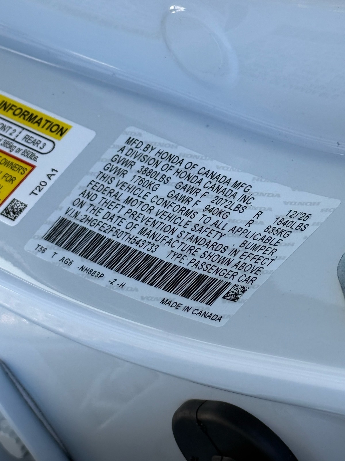 - VIN : 2HGFE2F50TH543733
