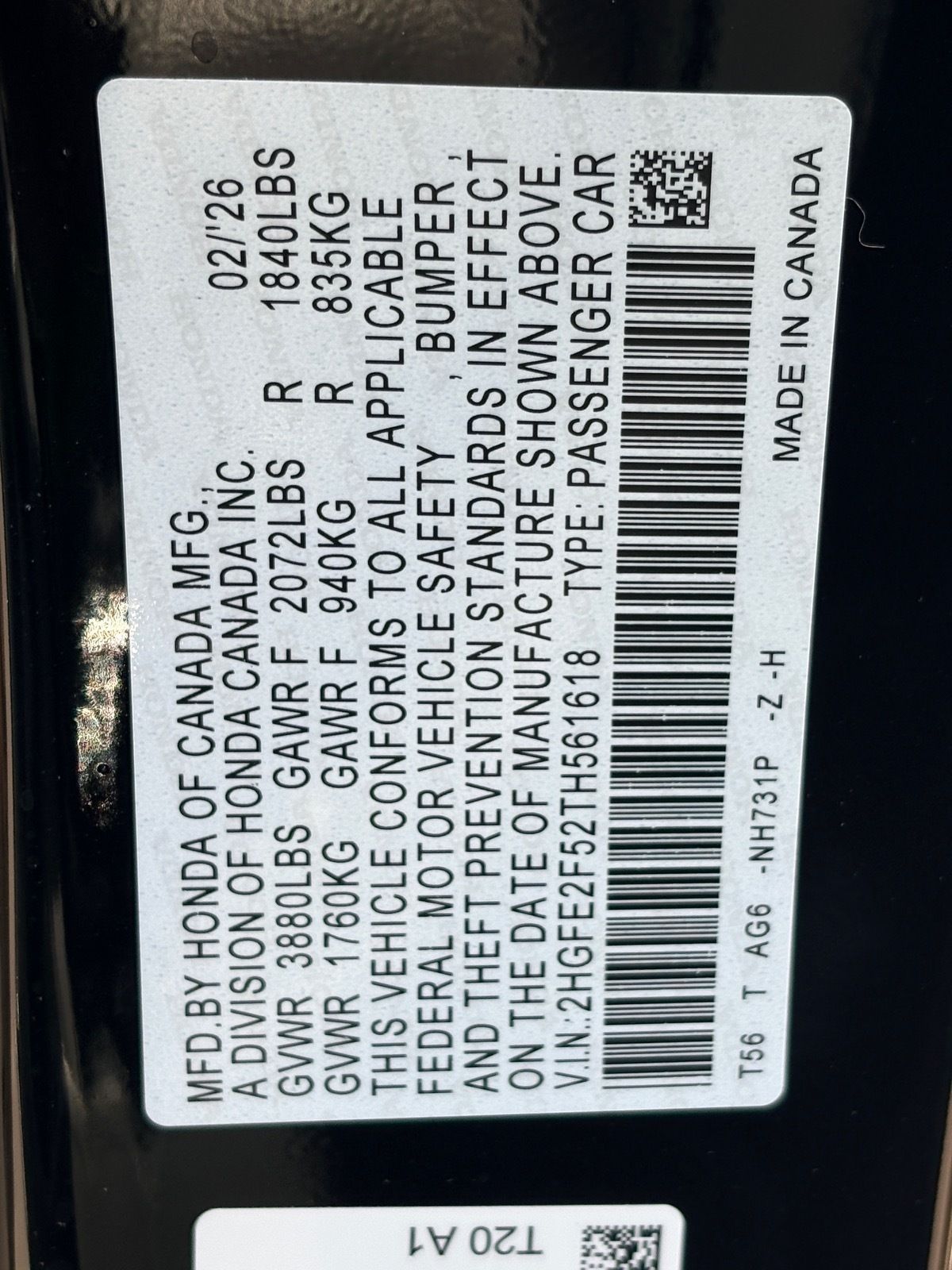 - VIN : 2HGFE2F52TH561618