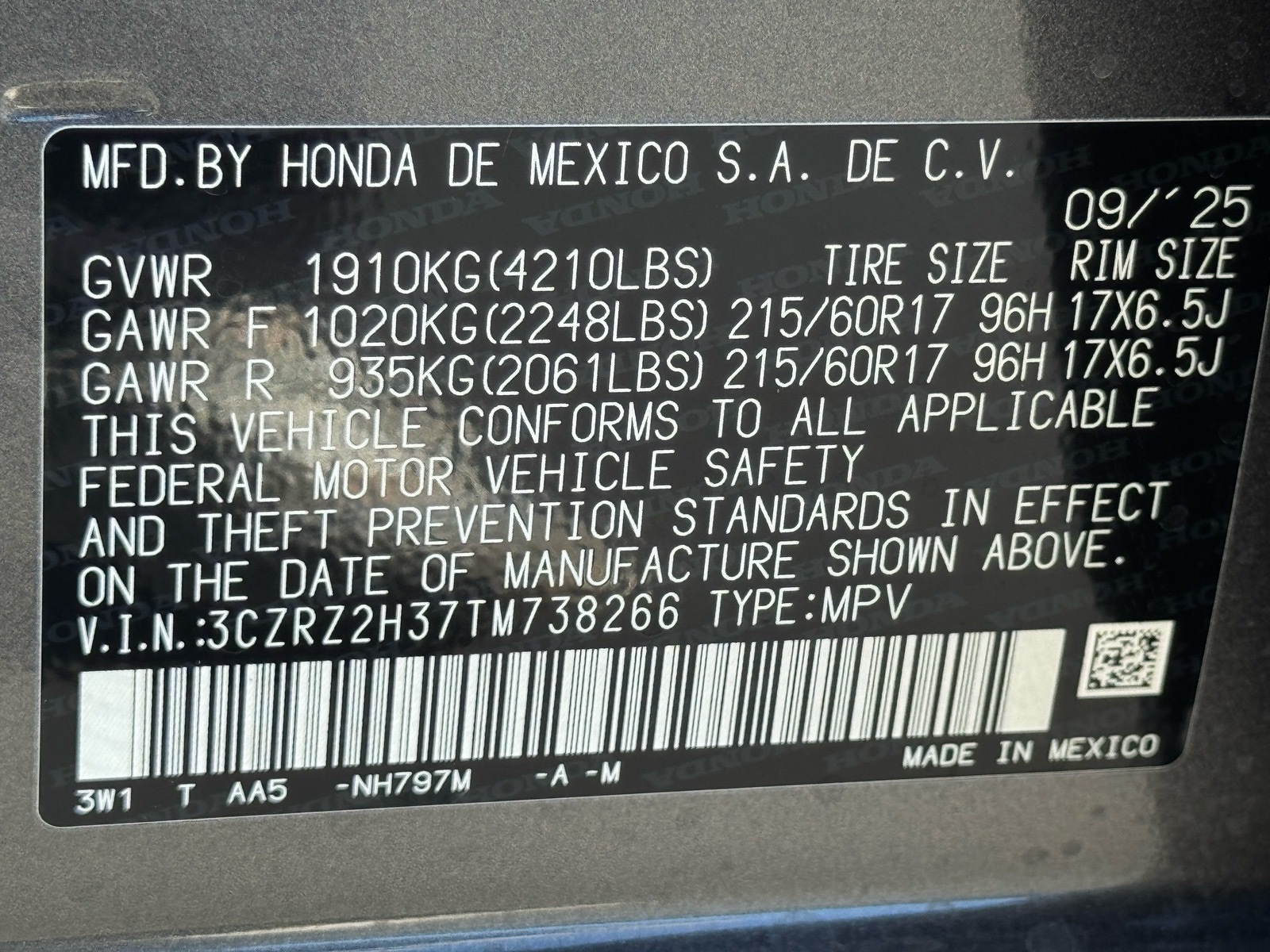 - VIN : 3CZRZ2H37TM738266