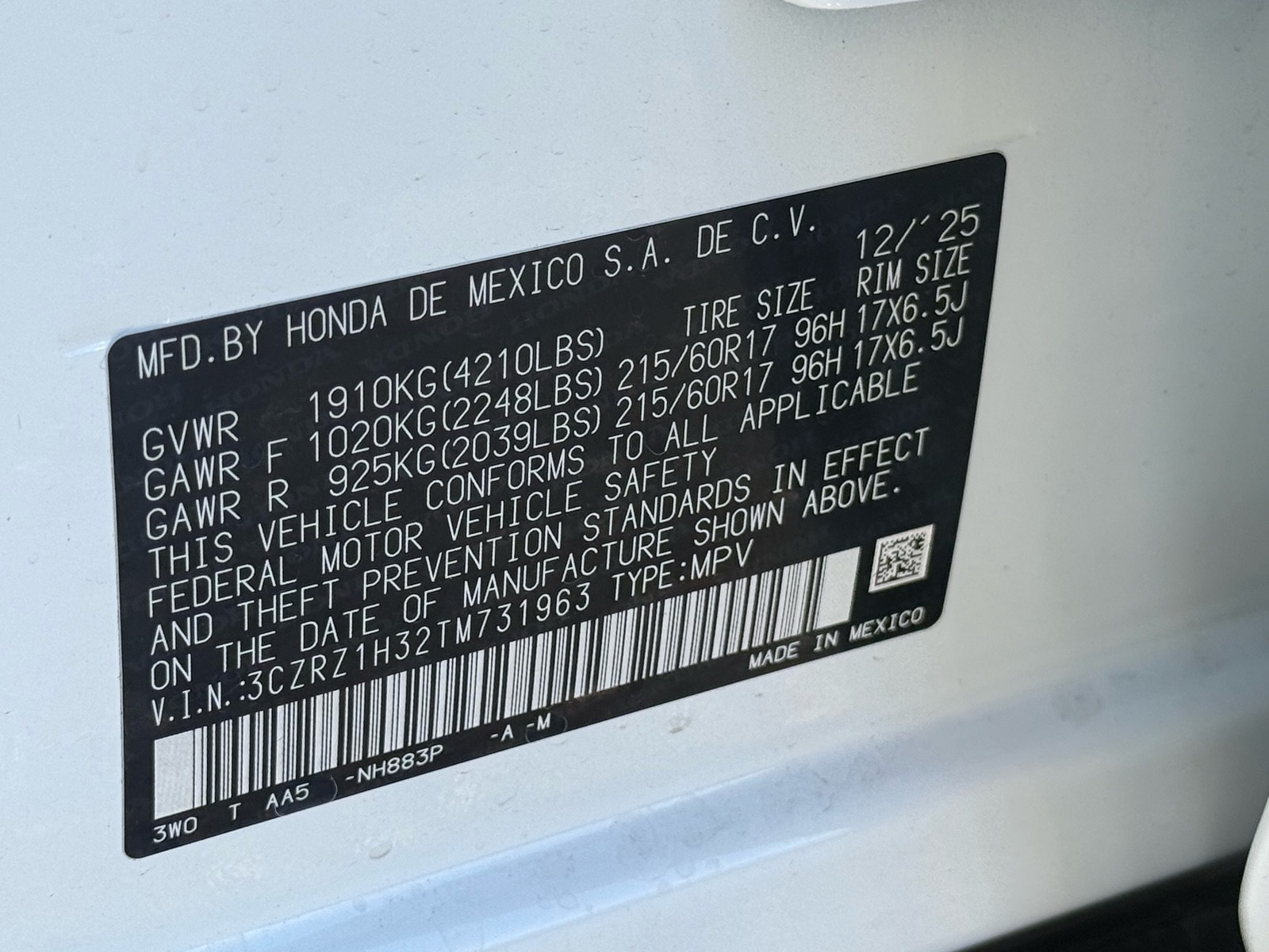 - VIN : 3CZRZ1H32TM731963
