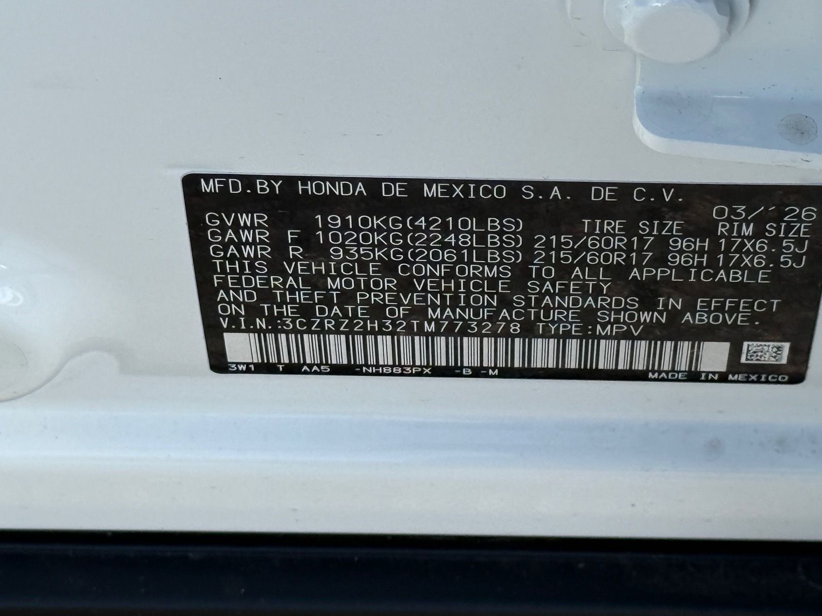 - VIN : 3CZRZ2H32TM773278