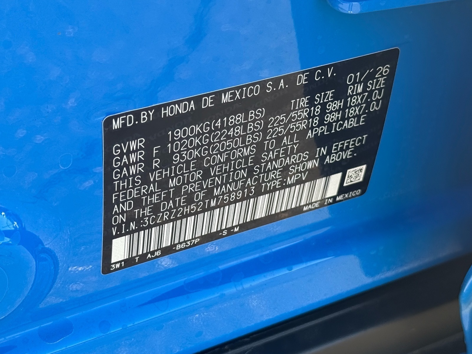 Boost Blue Pearl 2026 Honda HR-V Sport AWD CVT 2.0L I4 DOHC 16V i-VTEC