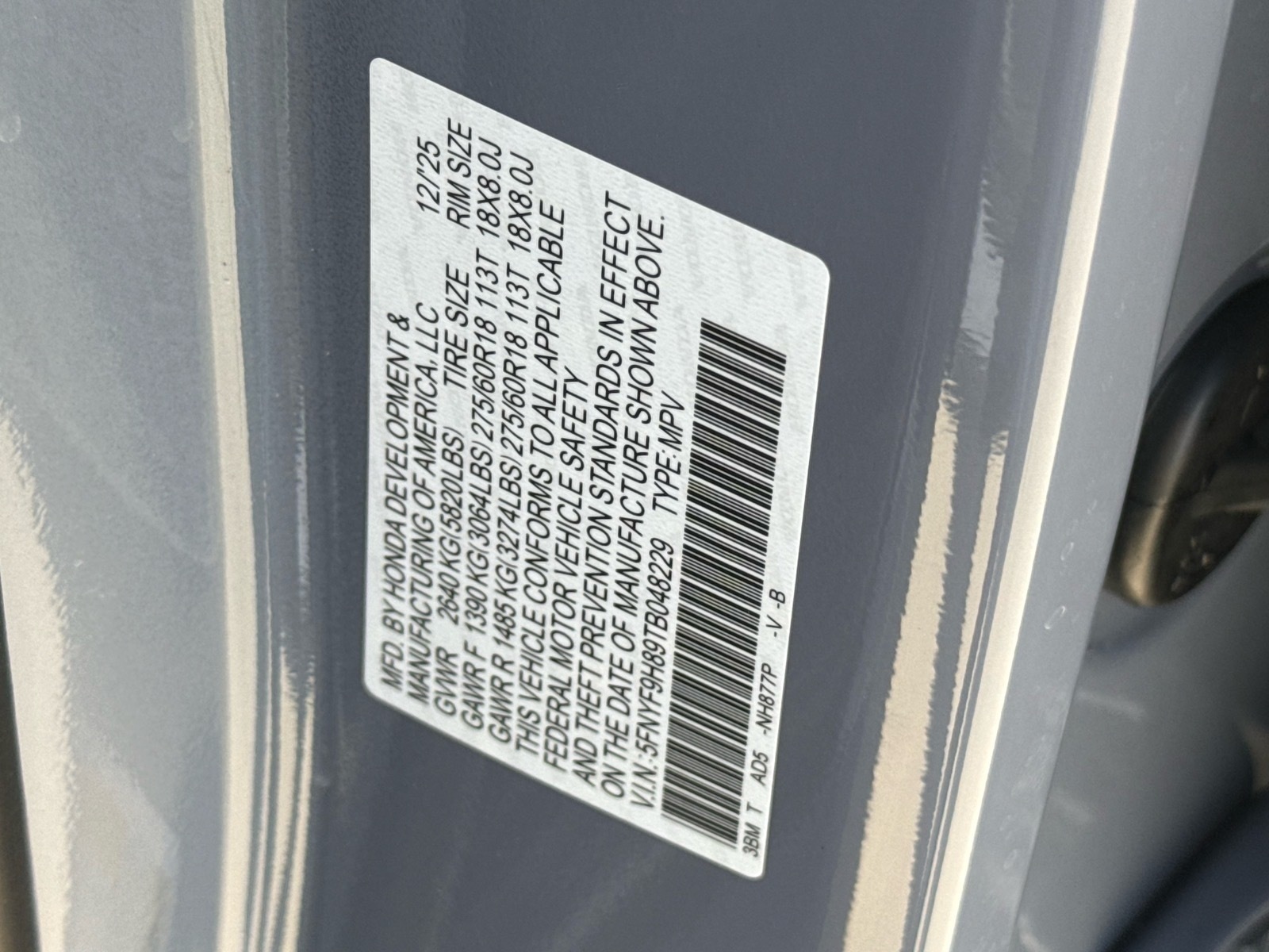 - VIN : 5FNYF9H89TB048229