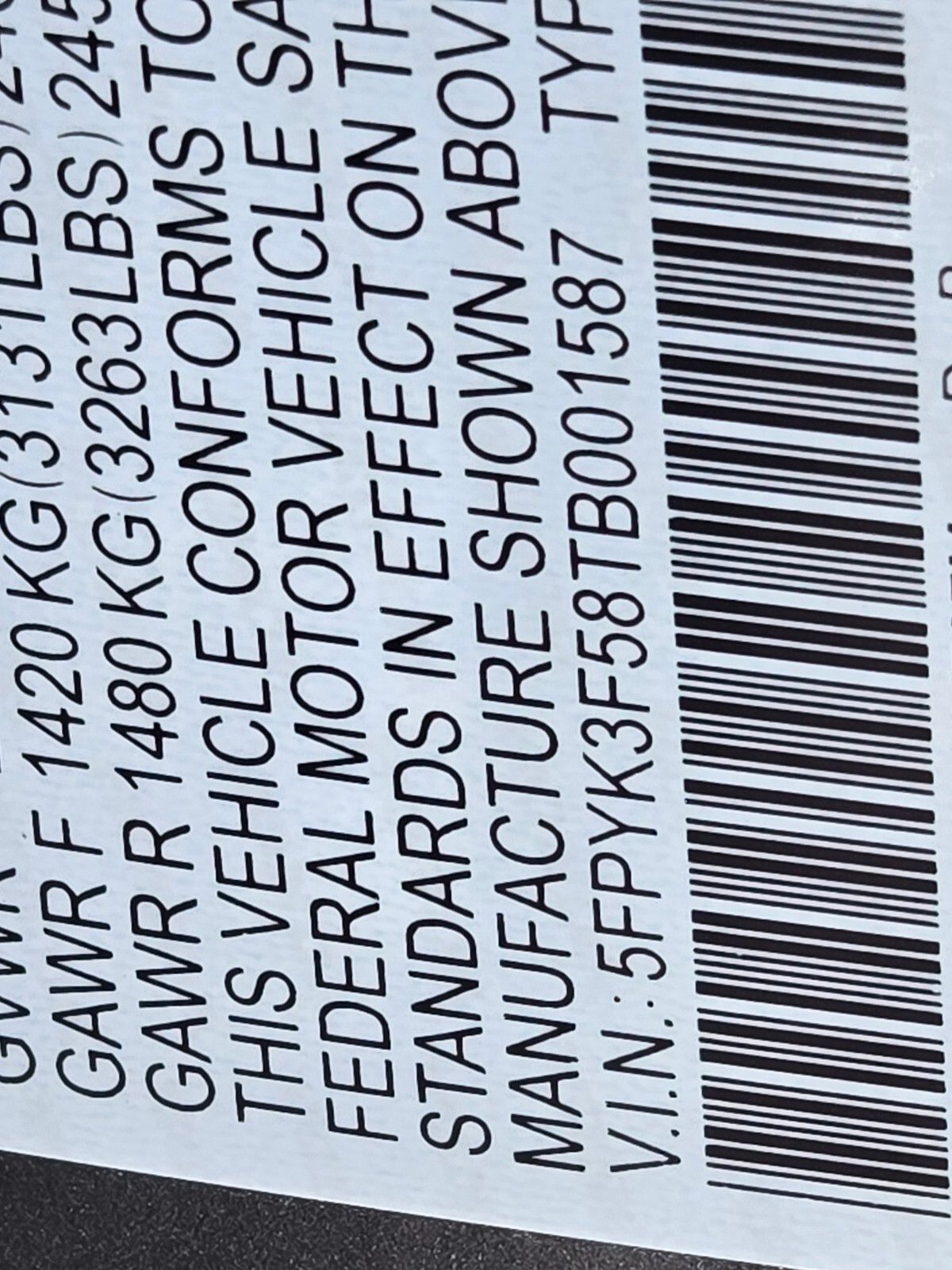 - VIN : 5FPYK3F58TB001587