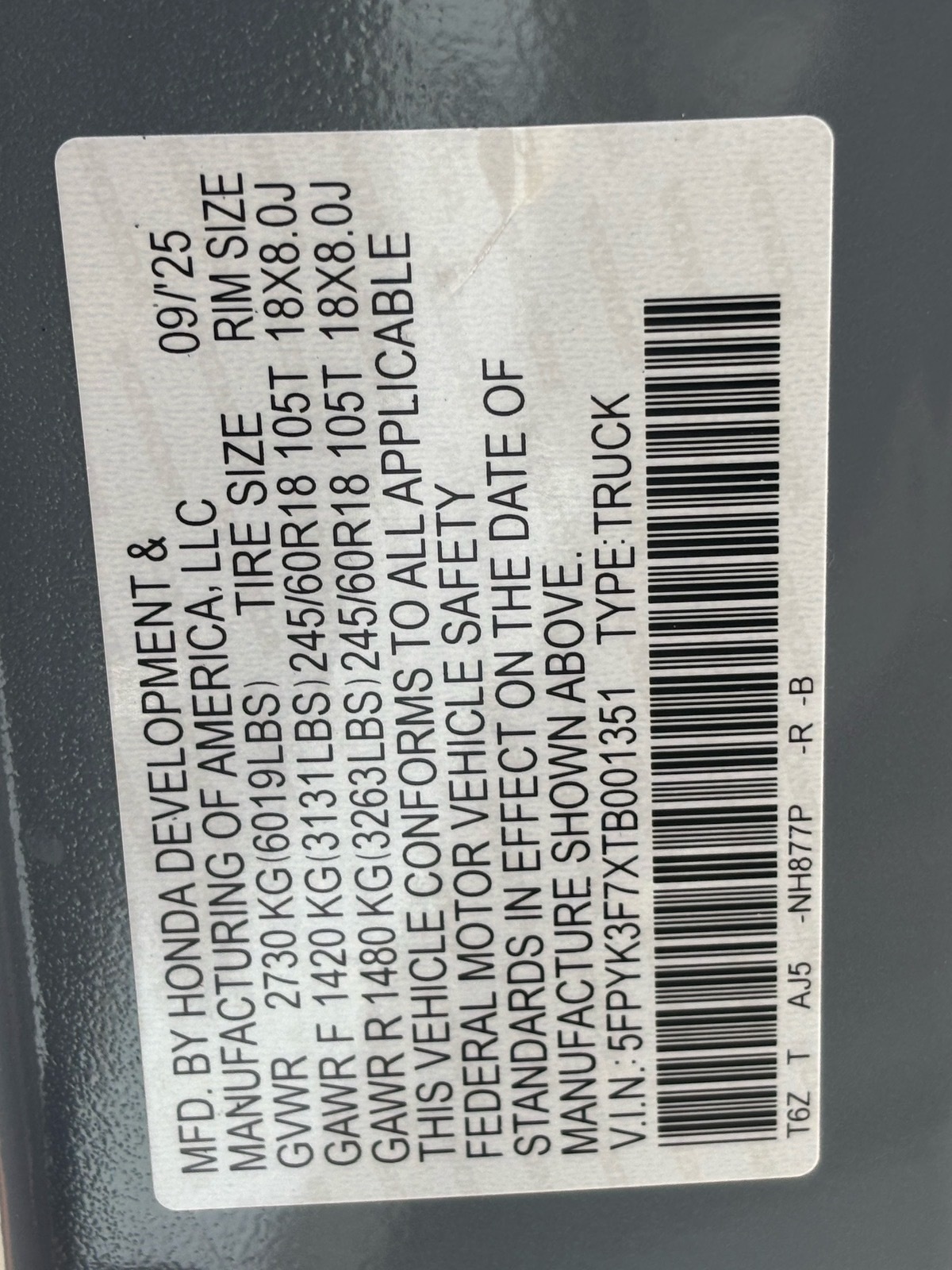 - VIN : 5FPYK3F7XTB001351