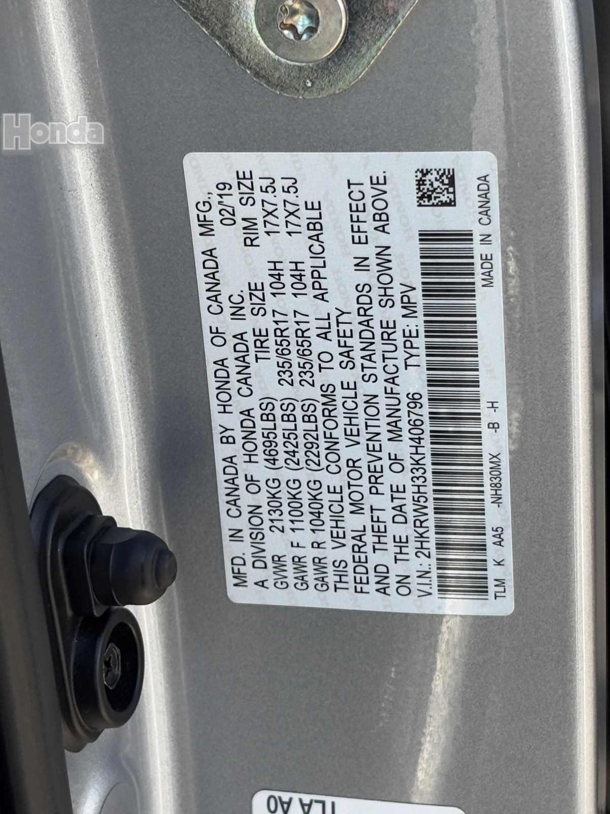- VIN : 2HKRW5H33KH406796