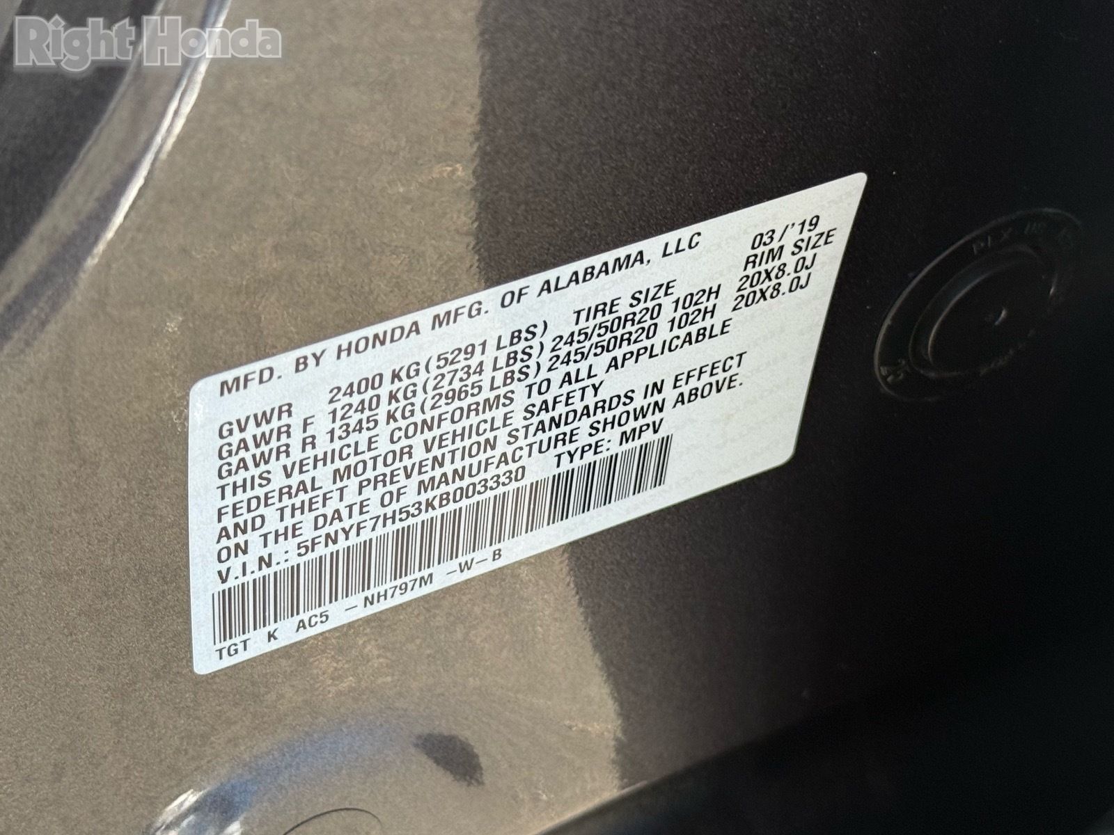 - VIN : 5FNYF7H53KB003330