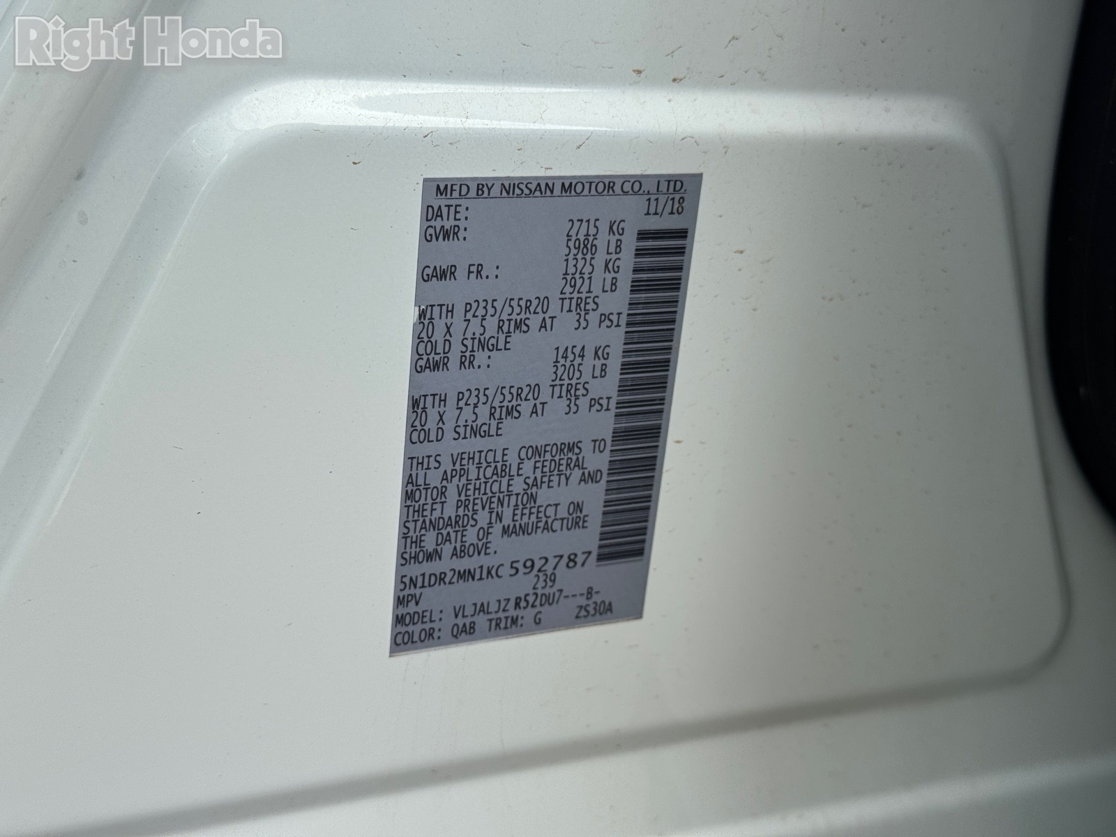 - VIN : 5N1DR2MN1KC592787