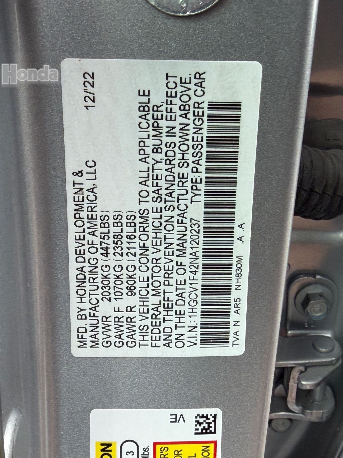 - VIN : 1HGCV1F42NA120237