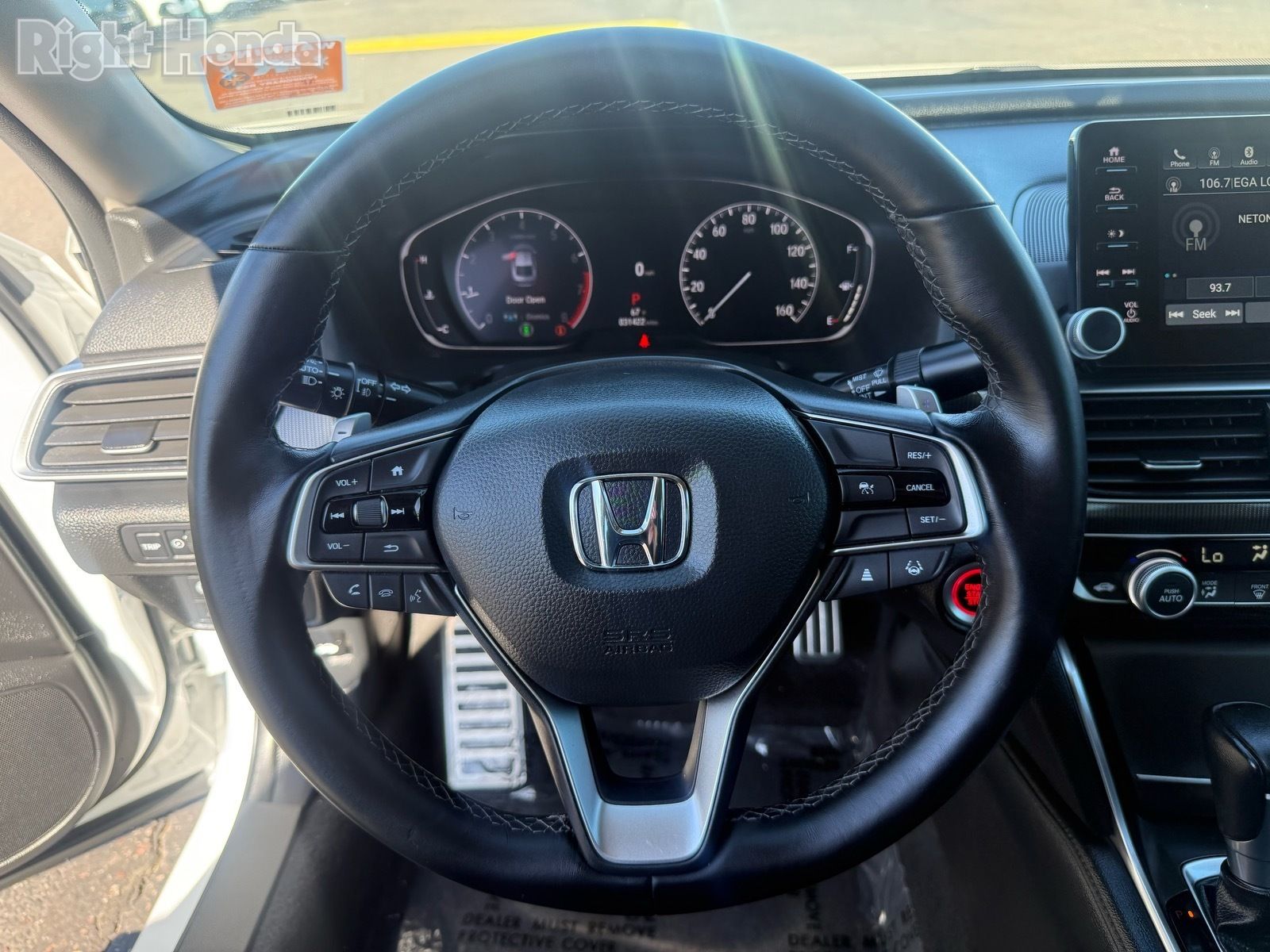 The exterior of this Accord is dressed in a striking White paint color, accentuated by 19-inch machine-finished alloy wheels with black inserts. The sporty styling is further enhanced by a sleek rear spoiler, adding a touch of athletic flair. Step inside, and you'll be greeted by a well-appointed cabin featuring perforated leather seating, a leather-wrapped steering wheel, and a host of advanced technologies.