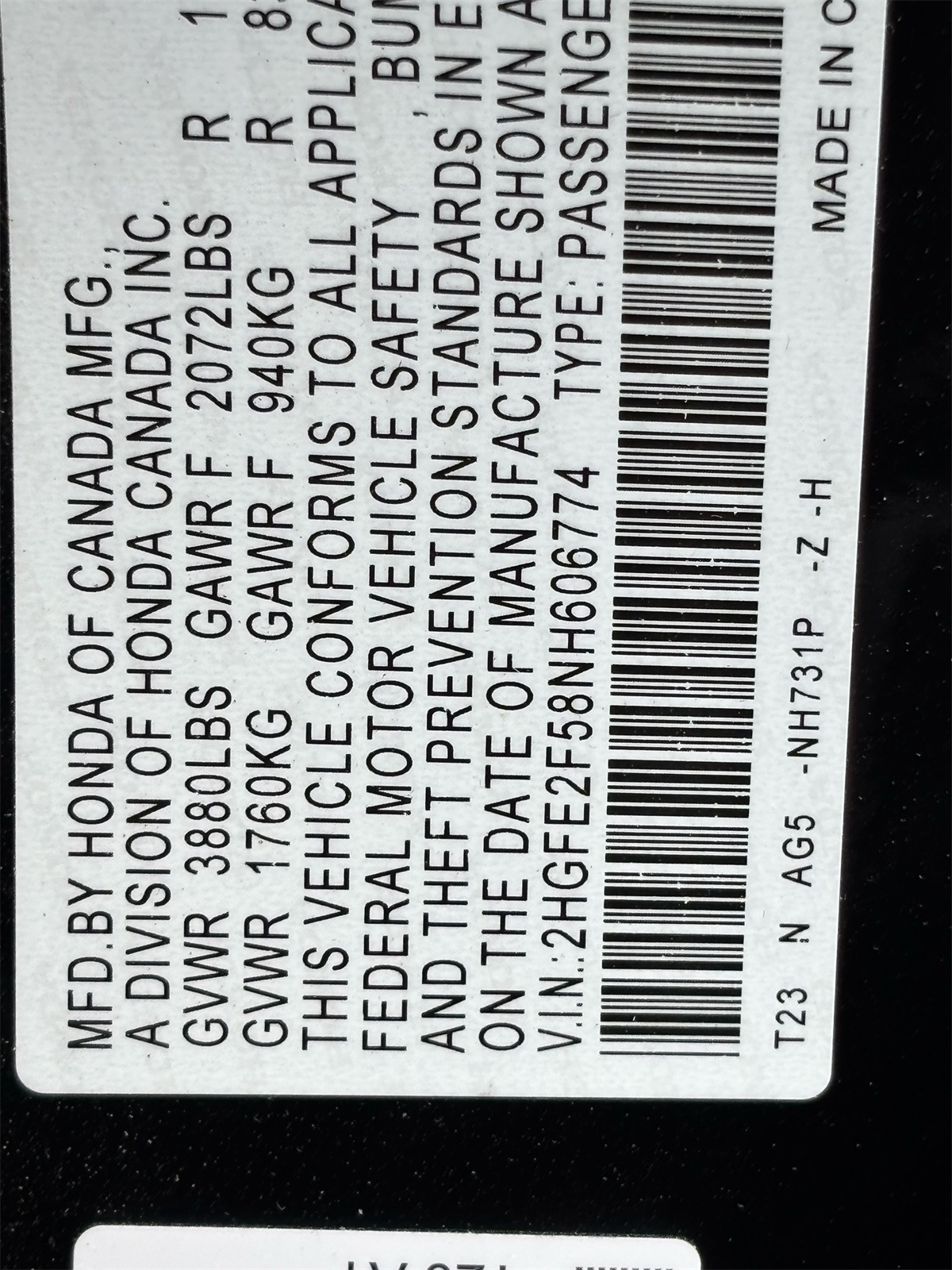 - VIN : 2HGFE2F58NH606774