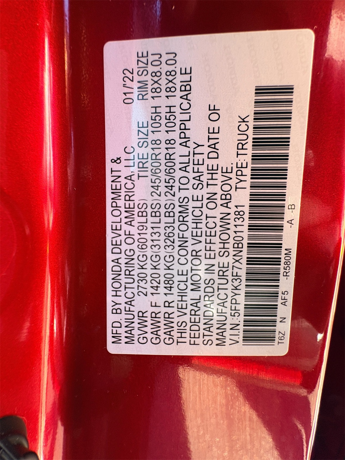 - VIN : 5FPYK3F7XNB011381