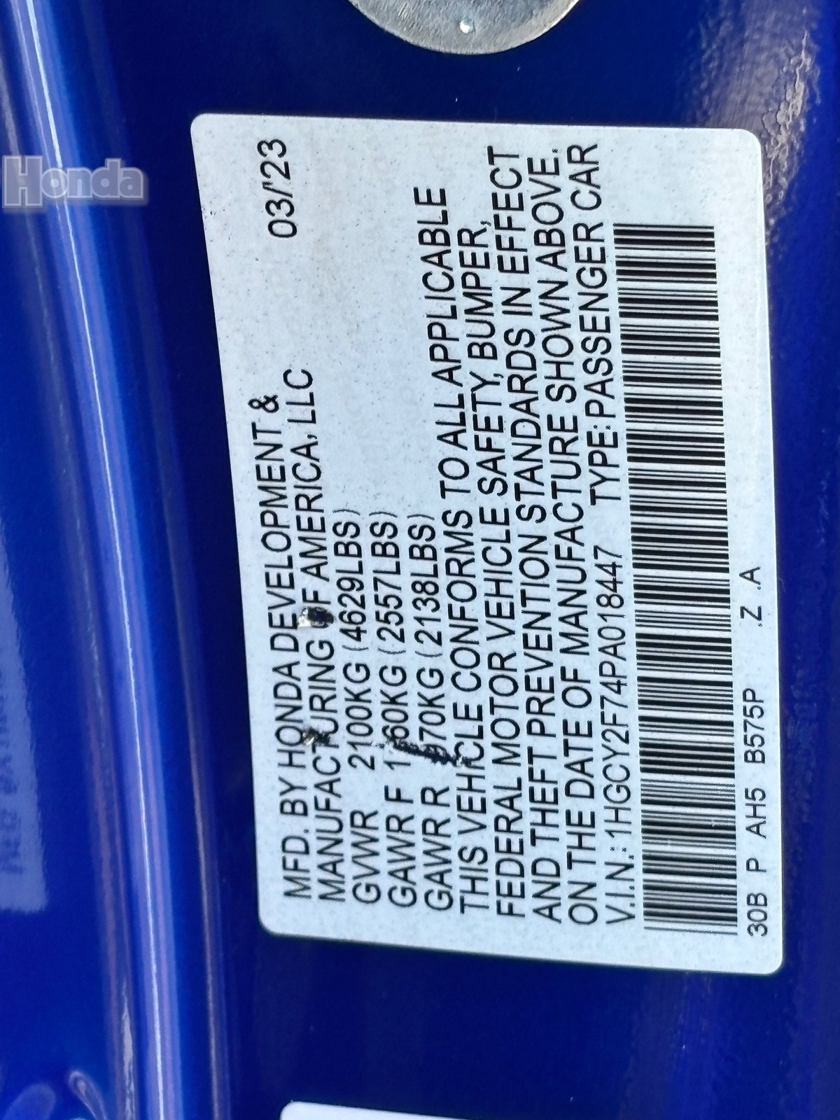 - VIN : 1HGCY2F74PA018447