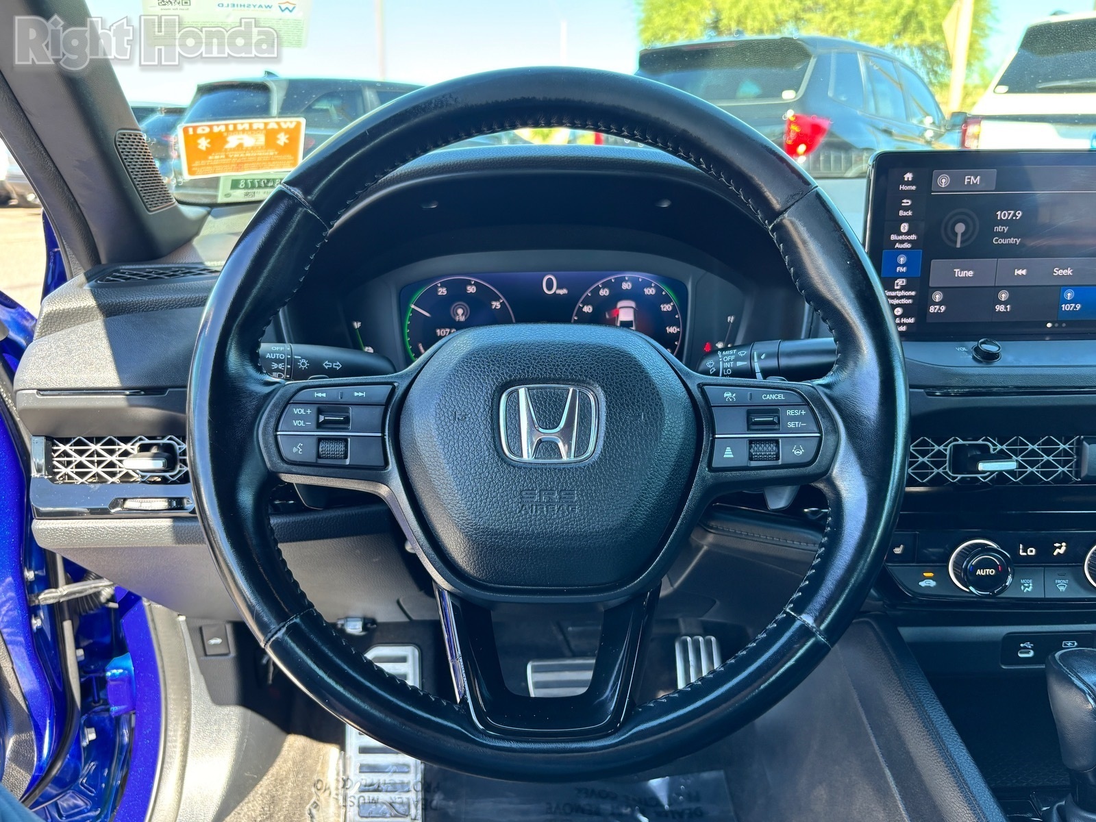 Blue 2023 Honda Accord Hybrid Sport-L FWD eCVT 2.0L 16V DOHC ######LOCAL TRADE!!!!######, -----CLEAN HISTORY REPORT------, *********CLEAN AS A PIN**********, ******BOUGHT HERE SERVICED HERE*******, ONE OWNER, 4-Wheel Disc Brakes, 8 Speakers, ABS brakes, Air Conditioning, AM/FM radio, Apple CarPlay/Android Auto, Automatic temperature control, Bumpers: body-color, Compass, Driver door bin, Driver vanity mirror, Dual front impact airbags, Dual front side impact airbags, Emergency communication system: HondaLink, Four wheel independent suspension, Front anti-roll bar, Front reading lights, Illuminated entry, Knee airbag, Leather Shift Knob, Leather steering wheel, Low tire pressure warning, Memory seat, Outside temperature display, Overhead console, Passenger vanity mirror, Power door mirrors, Power driver seat, Power steering, Power windows, Radio data system, Radio: 180-Watt Audio System, Rear reading lights, Rear seat center armrest, Rear window defroster, Remote keyless entry, Speed-sensing steering, Spoiler, Telescoping steering wheel, Tilt steering wheel, Traction control, Trip computer.