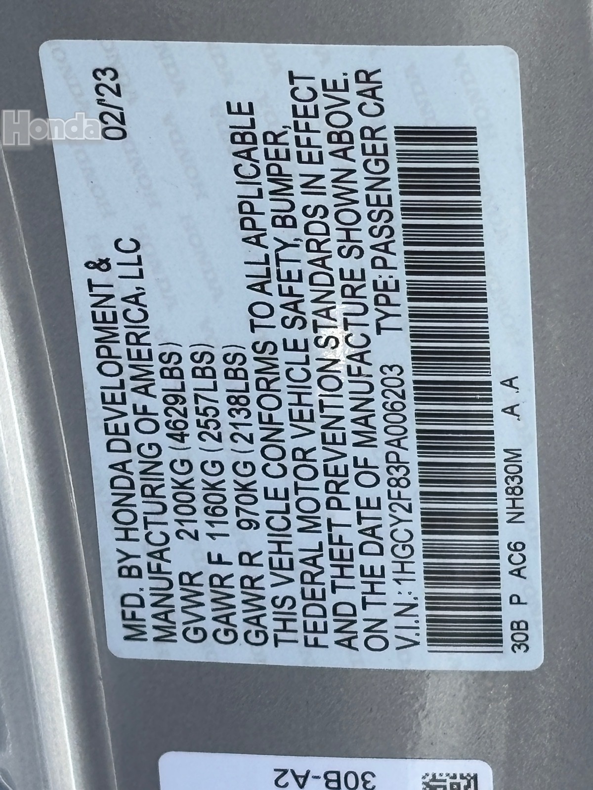 - VIN : 1HGCY2F83PA006203