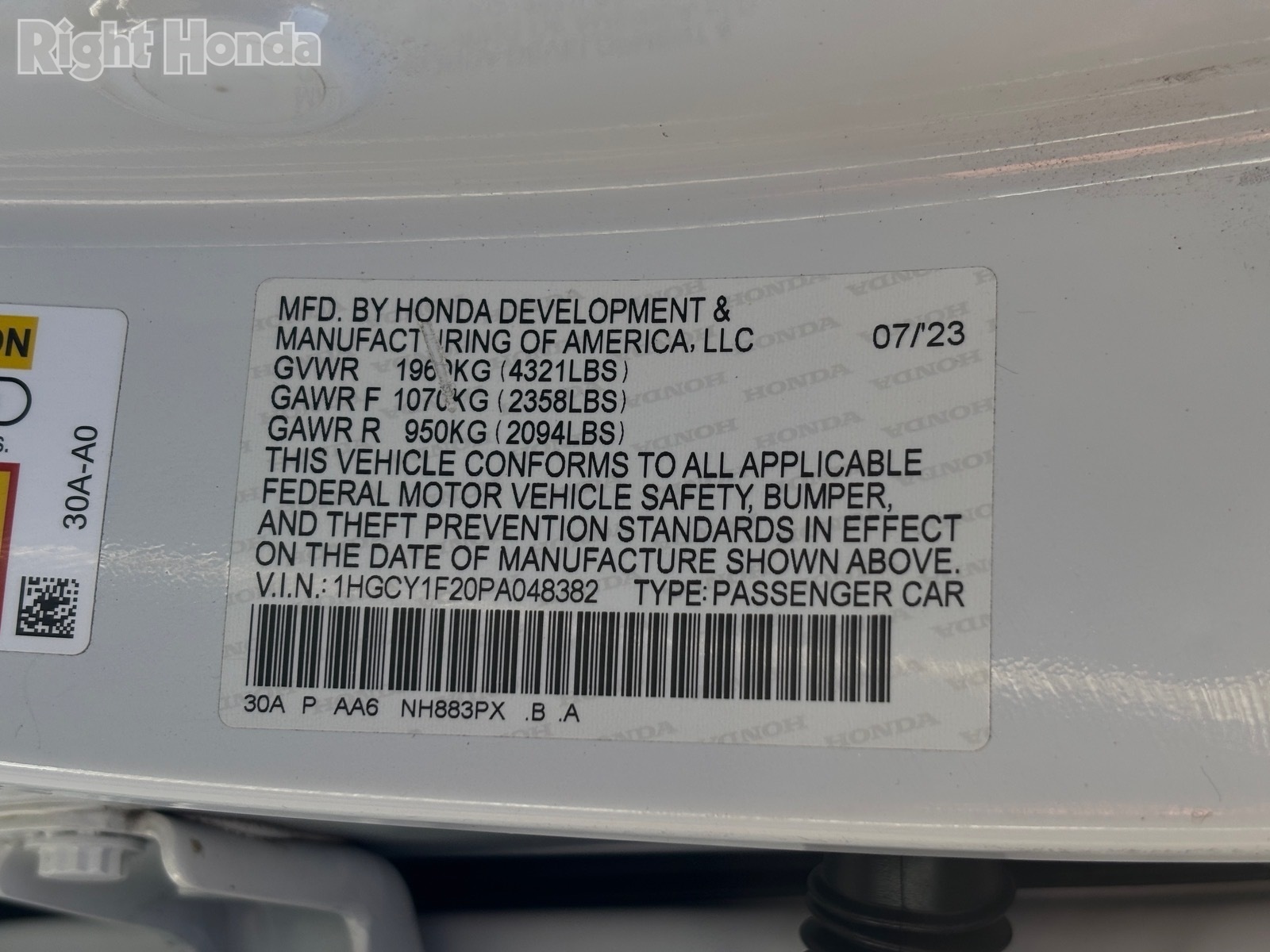 - VIN : 1HGCY1F20PA048382