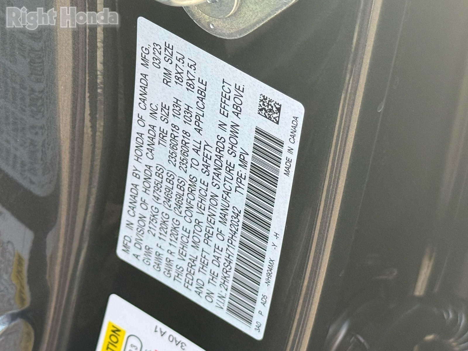 - VIN : 2HKRS4H71PH420342