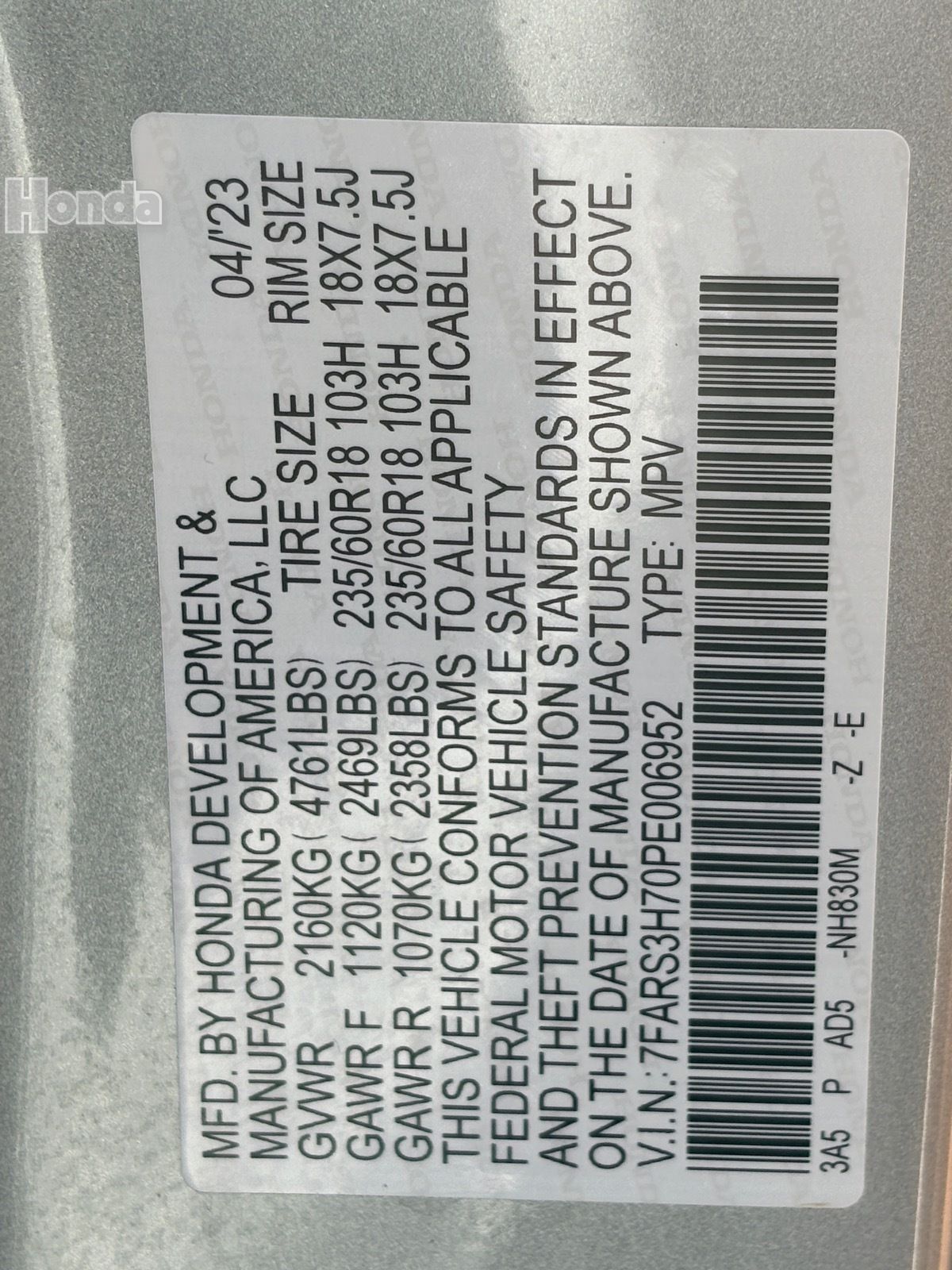 - VIN : 7FARS3H70PE006952