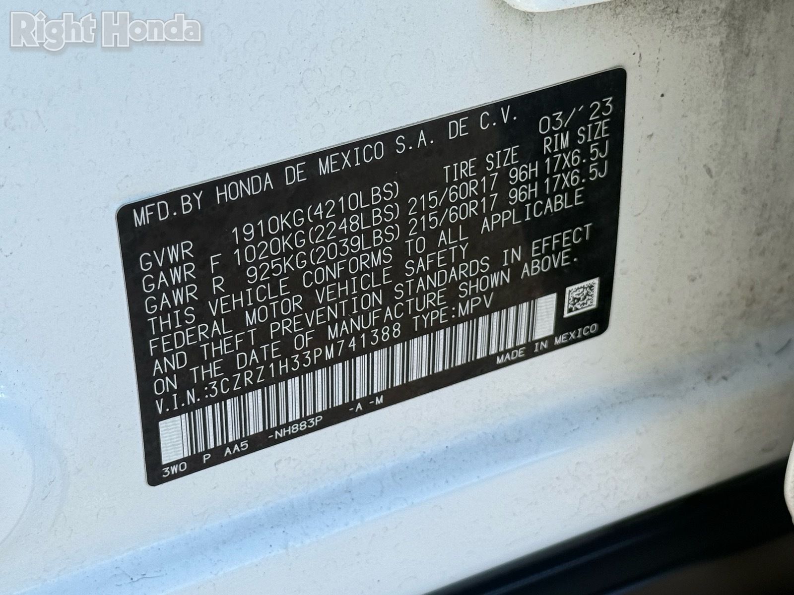 - VIN : 3CZRZ1H33PM741388
