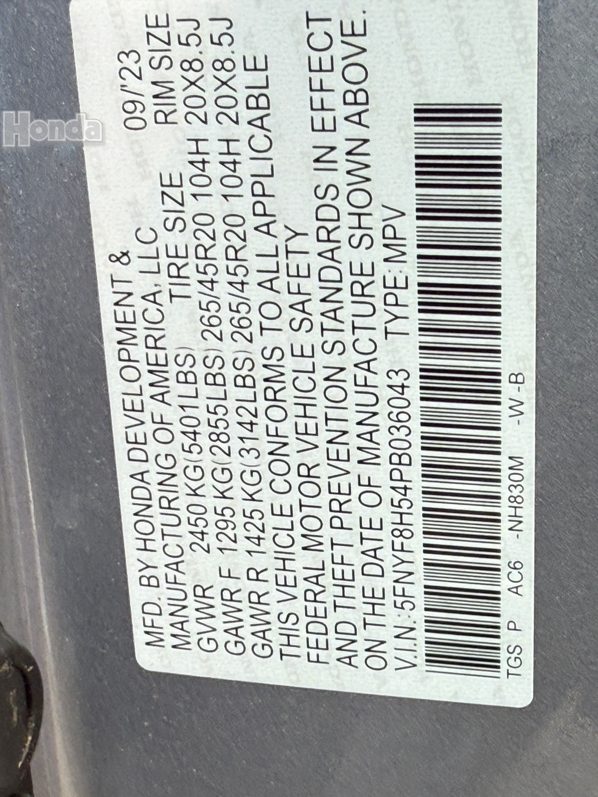- VIN : 5FNYF8H54PB036043